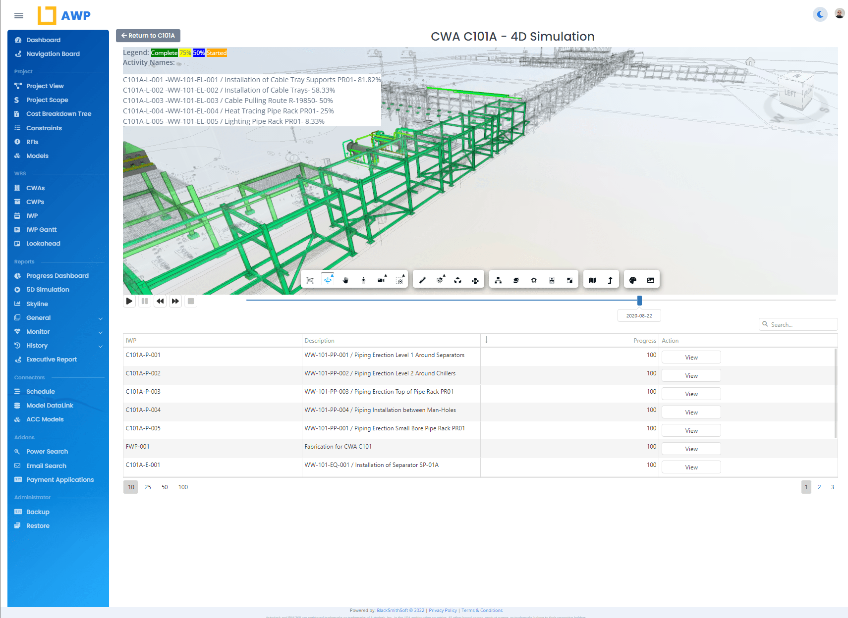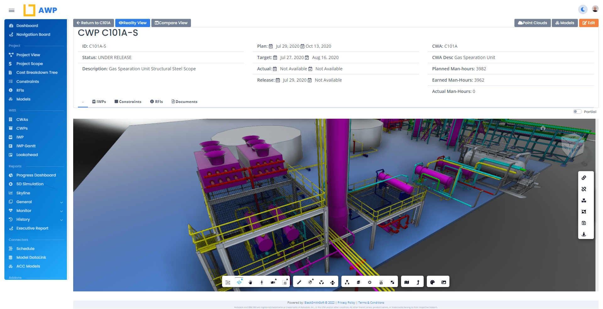 BlackSmithSoft AWP was designed to manage the AWP process integrating 3D models, schedules, constraints, materials, and field progress in one portal accessible from any browser, smartphone, or tablet. BlackSmithSoft AWP is focused on managing CWAs, CWPs, and IWPs fully integrated into Autodesk Construction Cloud®.