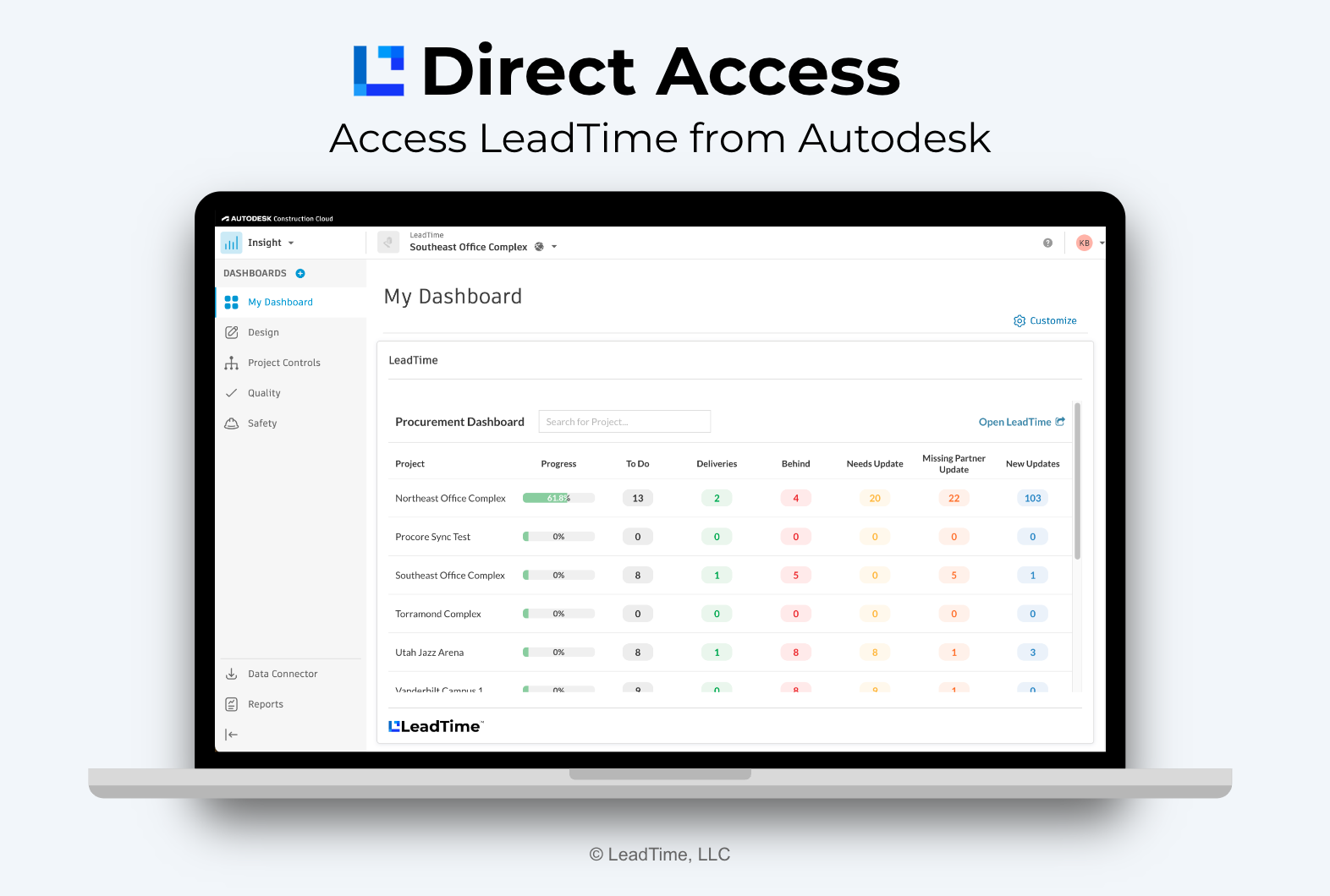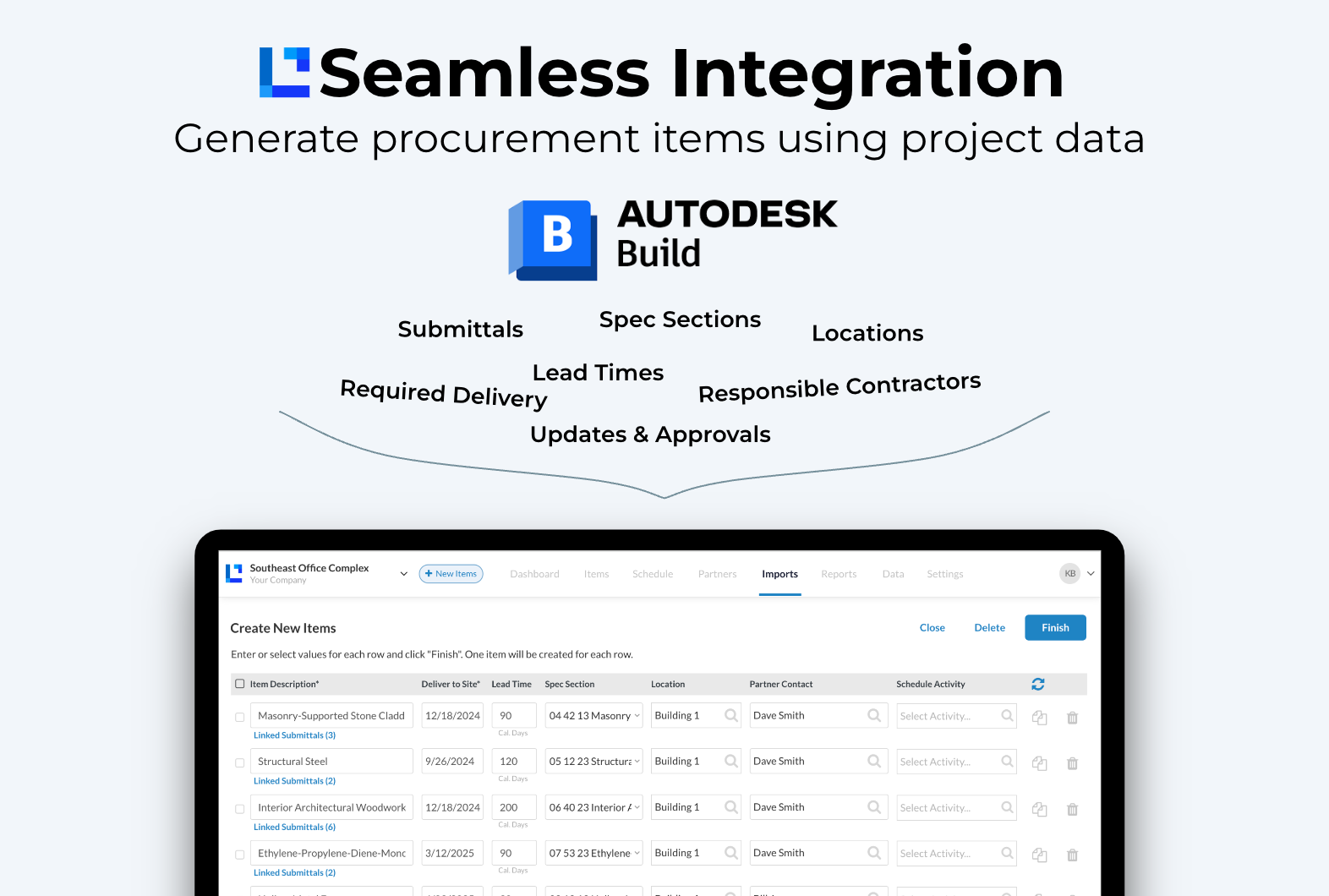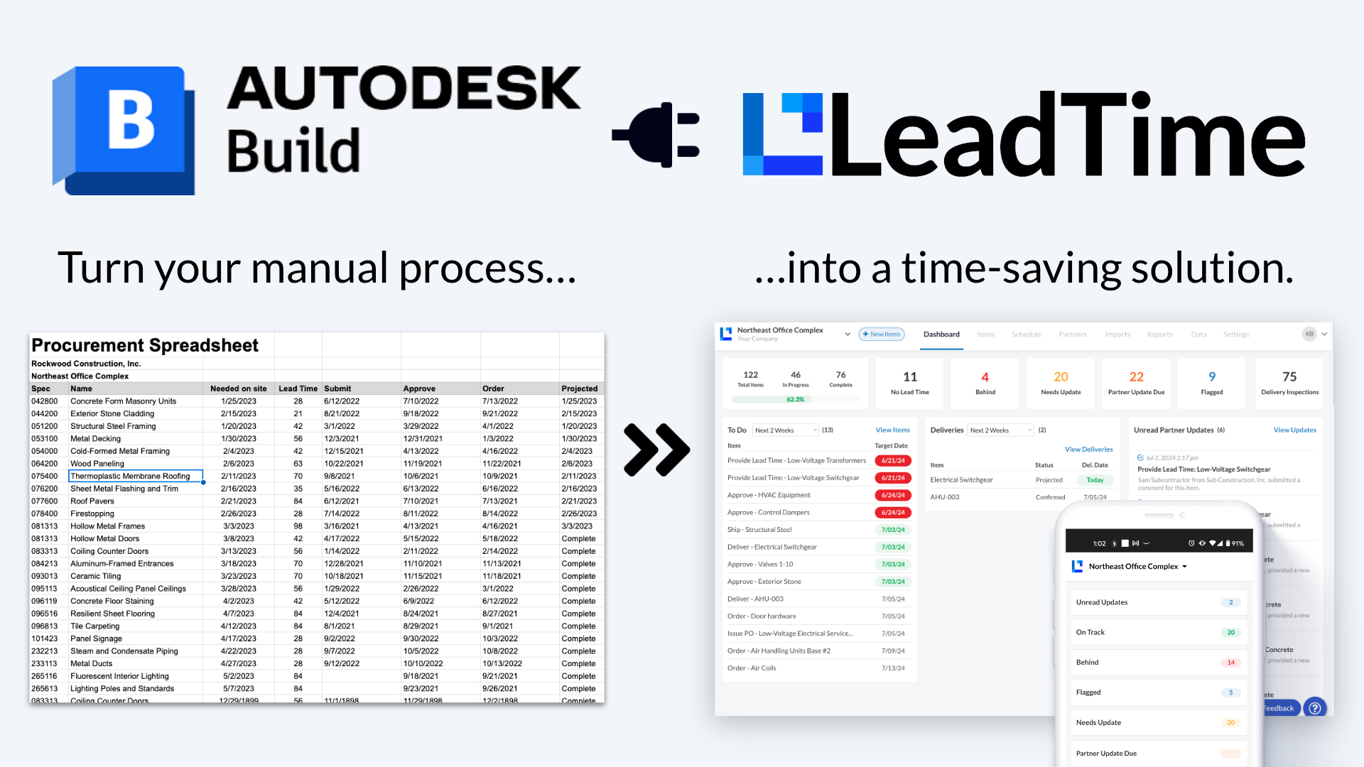 LeadTime transforms your manual procurement process into a streamlined, time-saving solution that keeps projects on schedule. Seamlessly integrated with Autodesk® Build, LeadTime replaces spreadsheets by automating procurement log creation and synchronizing submittal approvals. Collaborate effortlessly with building partners, link project schedules, and track every detail in real-time—from source to job site—ensuring project materials and equipment are delivered on time.