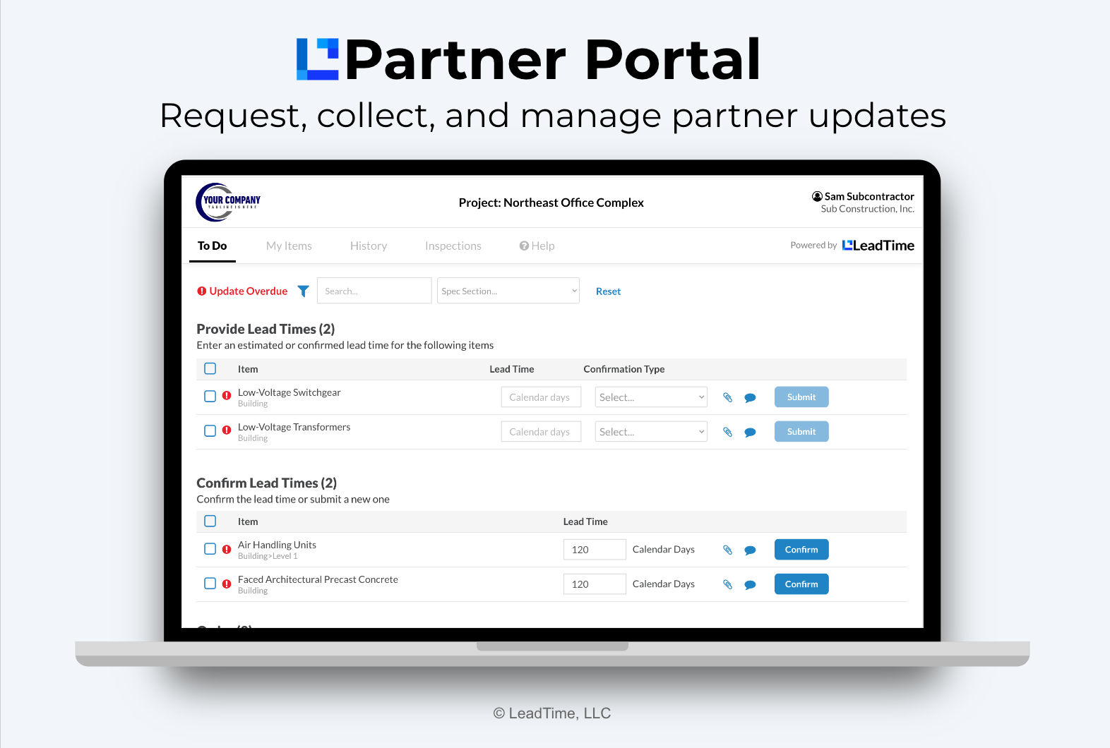 Collaborate with Building Partners: The Partner Portal makes it easy for your partners to submit lead times, confirm orders, track shipments, and coordinate deliveries.