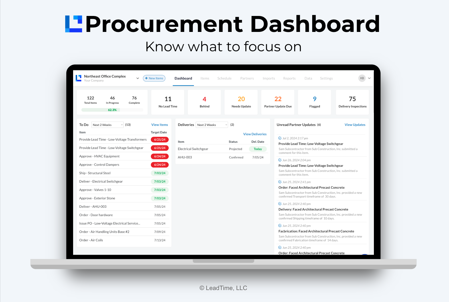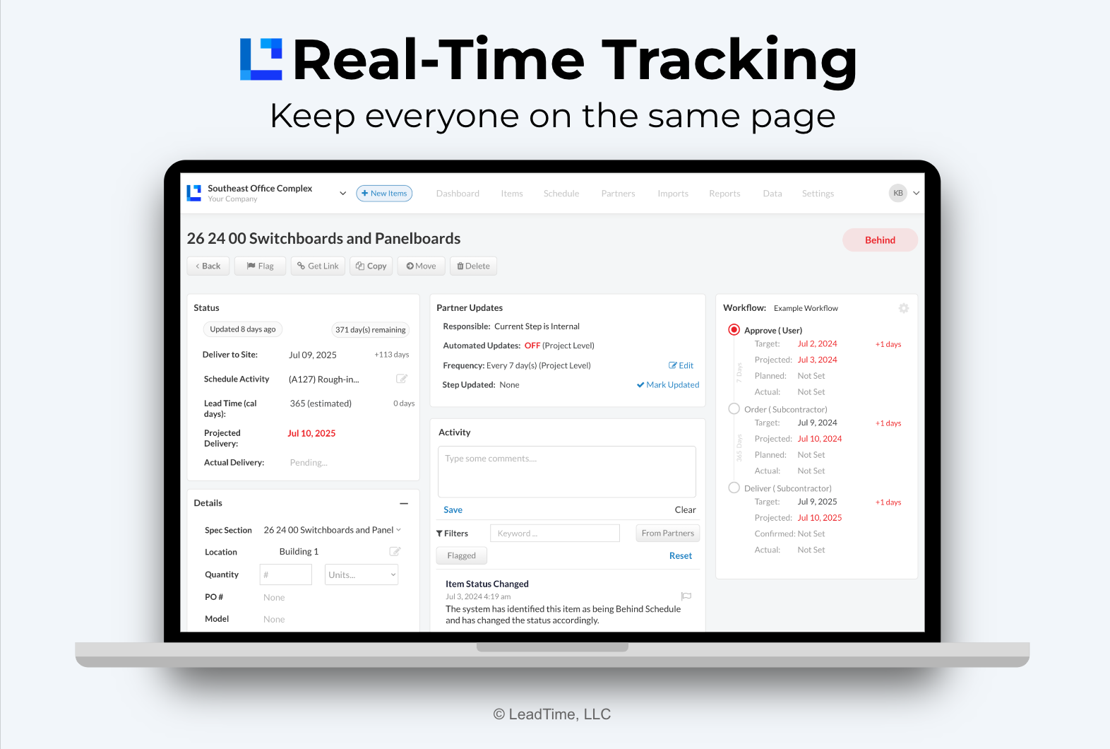 Real-Time Tracking & Reporting: Track procurement in real-time and stay ahead of potential delays with customizable lookaheads and reports. Ensure everyone is on the same page with up-to-date, actionable information.