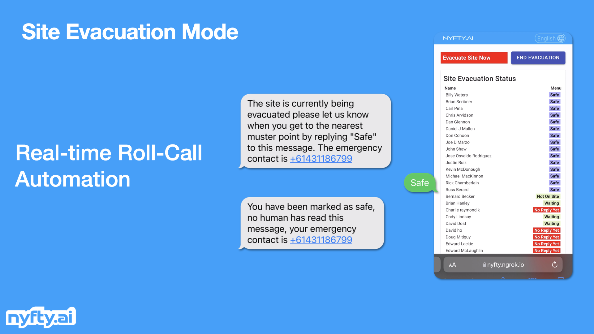 Evacuation Mode can be triggered to assist with automating roll calls when you evacuate a job site. Superintendents and Foremen can see in real-time as their workers reply by SMS to say they have reached a muster point.