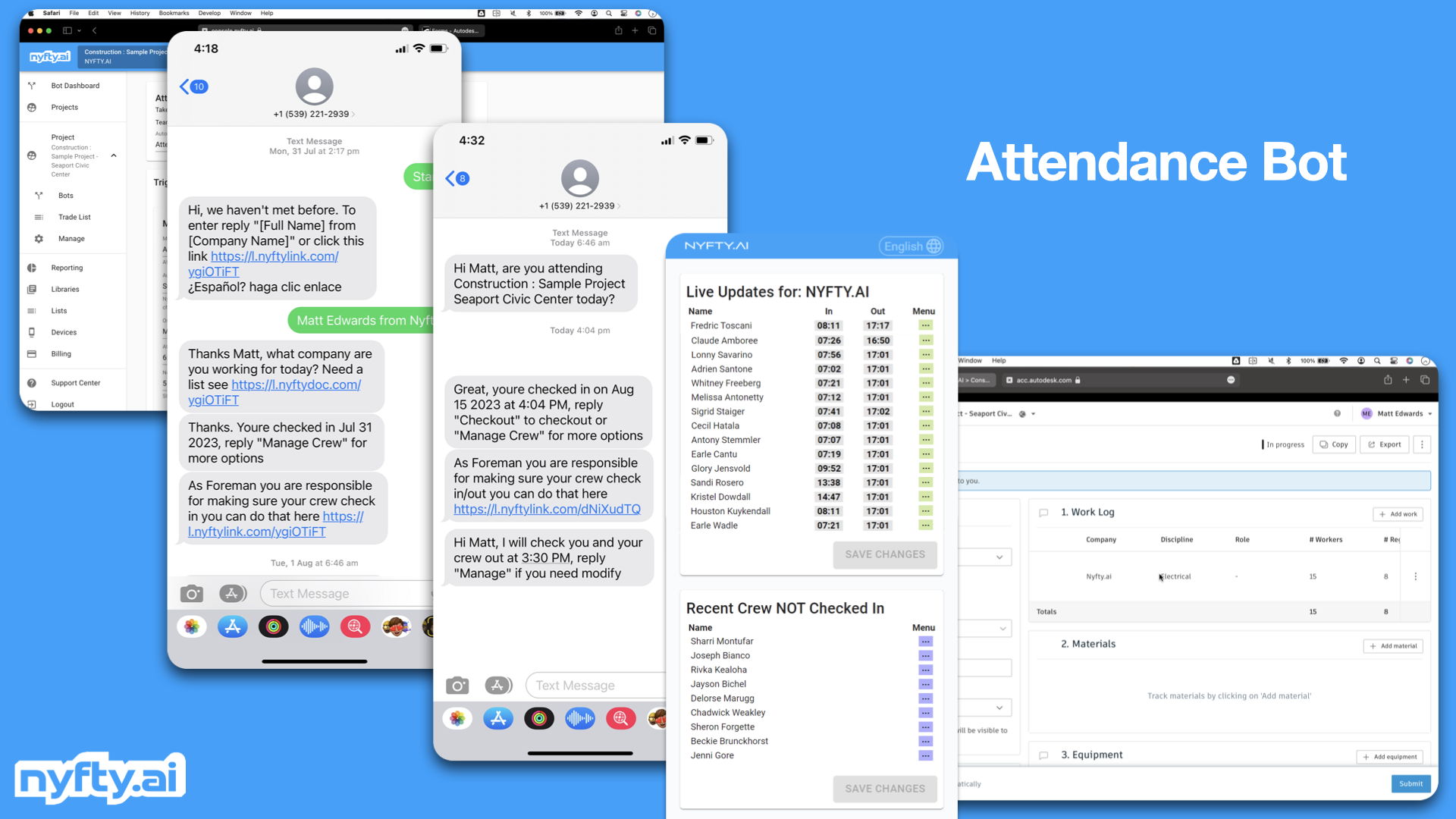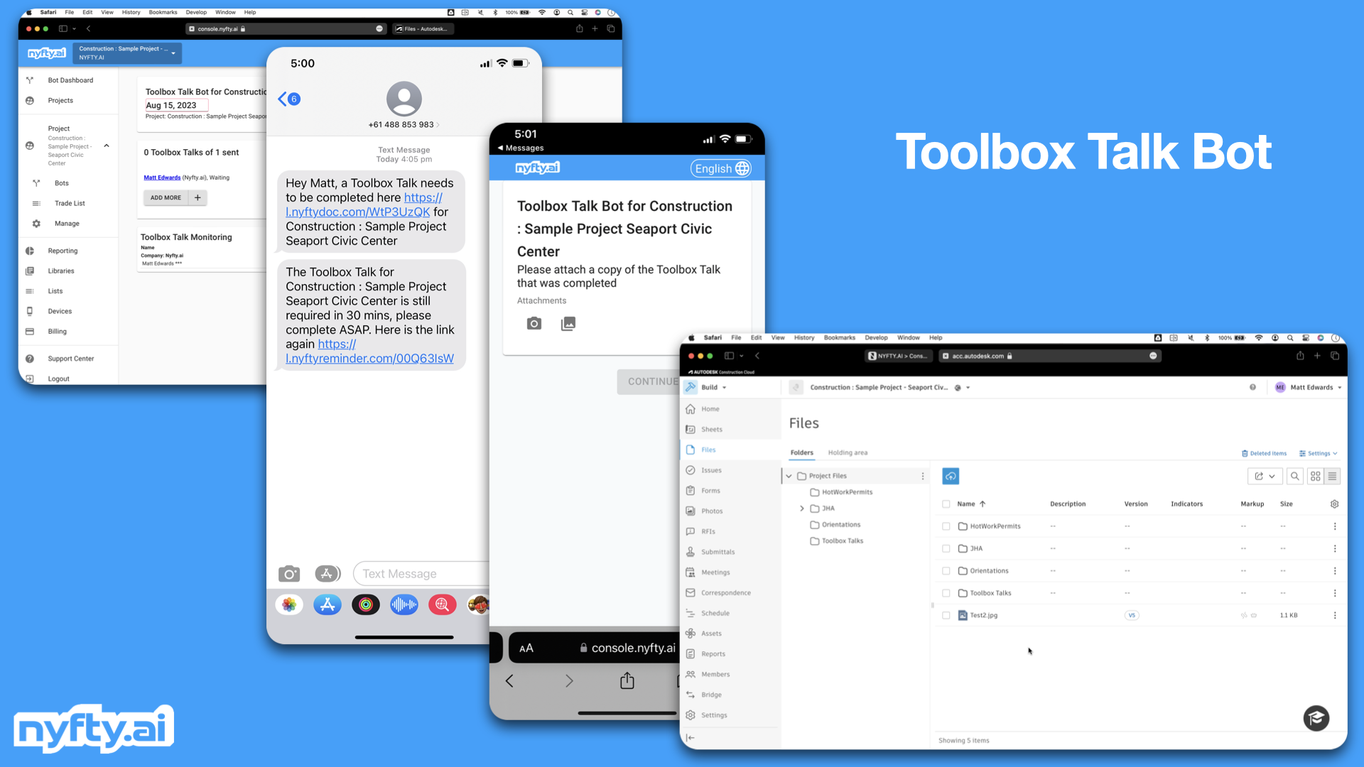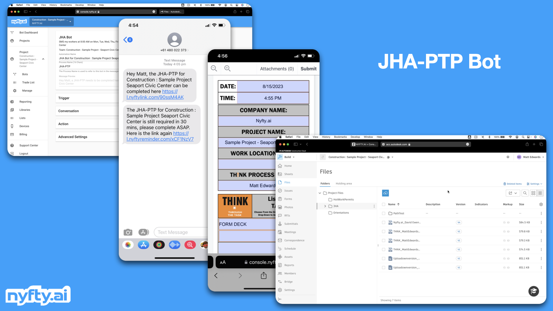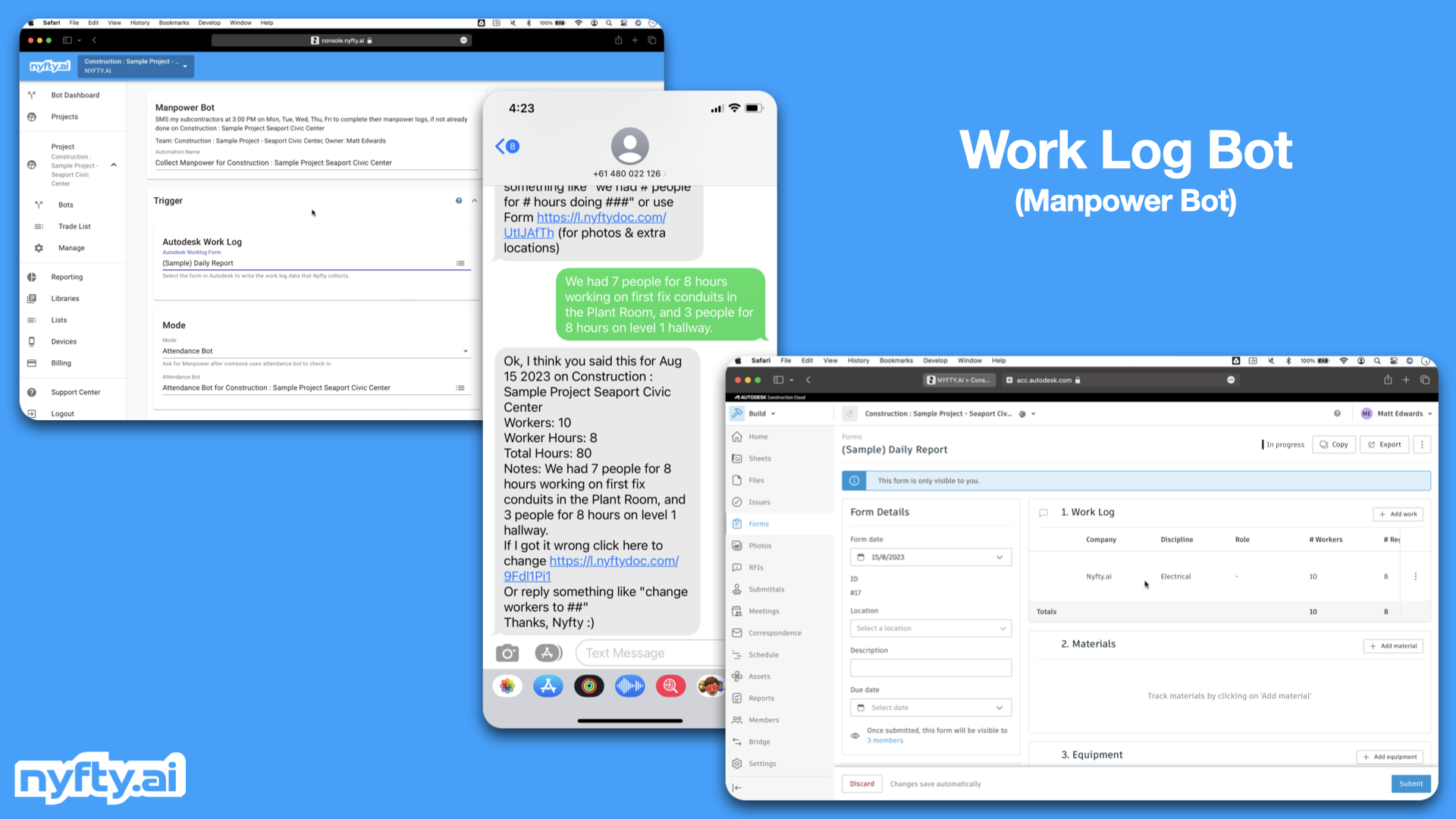 We automate field processes, i.e. getting people to comply with processes in your ACC account, like making sure Worklogs, JHAs, Toolbox Talks, etc are completed and saved to ACC. We use text messages to reach out to people, get them to complete the process, and then we save it back to Autodesk®.