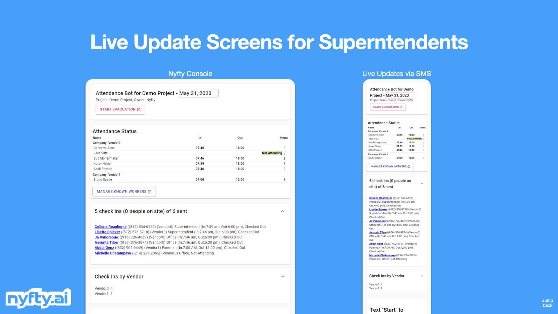 Foreman Only Mode is the most popular configuration, where Nyfty simply reaches out to each Foreman and asks them to select which of their workers are on site that day.