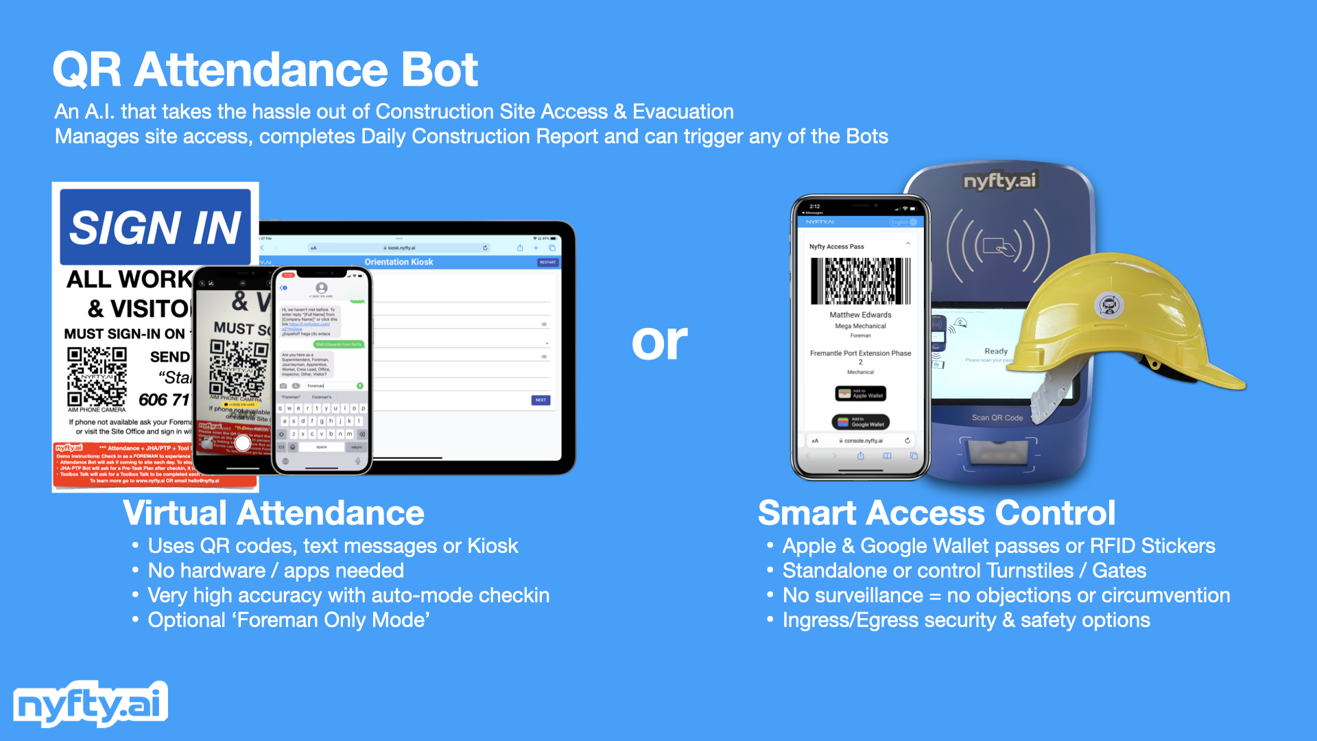 QR Attendance Bot - An AI for checking workers in and out of your job site, automating evacuation roll calls and writing Work Log data to the Site Diary.