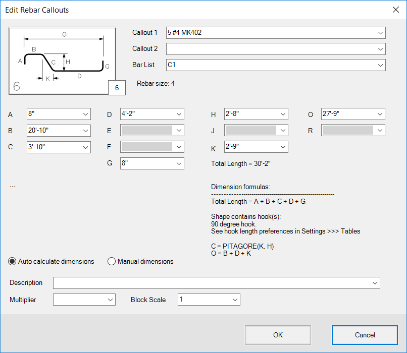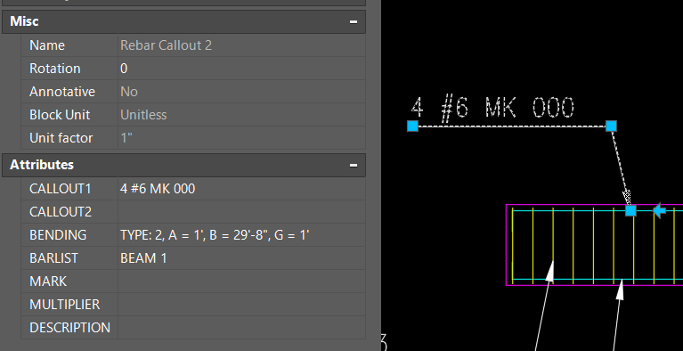 All the information of rebar will be written to the "Rebar Callout" block's attributes: rebar size, bending shape and dimensions, a number of rebars, rebar mark, and rebar table name (or barlist name).