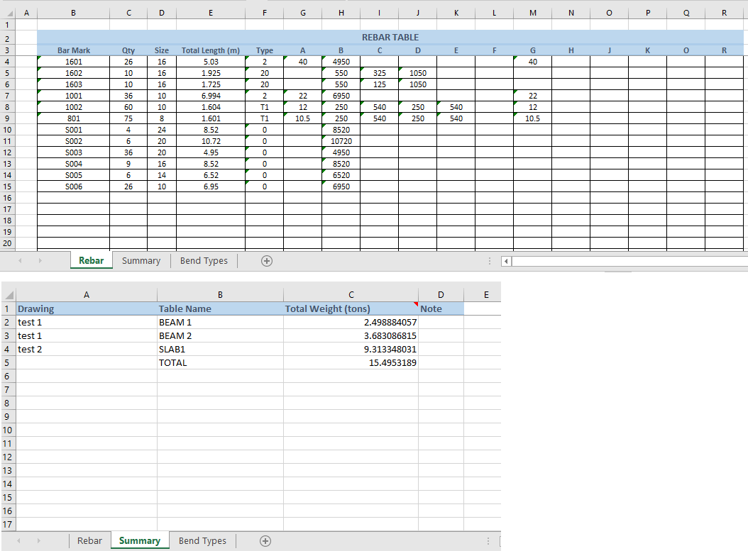 - Finally, all rebars information will be updated to the Rebar spreadsheet.xlsx Excel workbook.