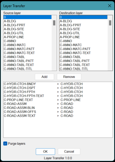 You can define the source and destination layers in an interactive dialog box. Select a source layer from the list on the left and a destination layer from the list on the right. Click the Add button to save the setting, and repeat this process as many times as needed to transfer objects from multiple source layers to the corresponding destination layers.