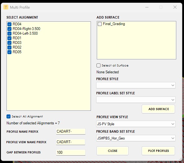 It does not add the profiles to the profile view for me. do not need the prefix for the profiles. would be nice if I had the option to have it only creat the profiles from a surface and pick the style for each profile. doing it by had is almost faster.