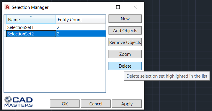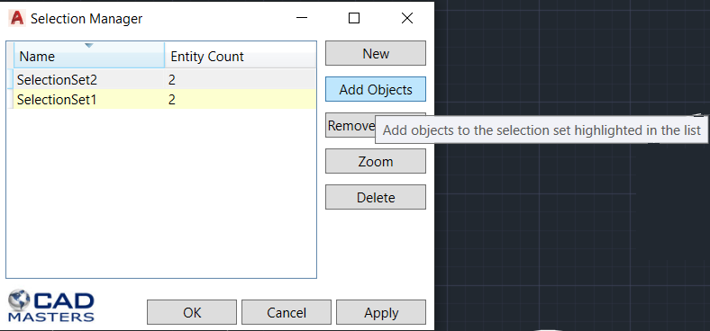 Selection Manager is an Autodesk® AutoCAD® add-in application that makes it easy to save and restore objects that you have selected in your drawing. Selection manager can be used to quickly save and restore the selection set. Selection sets are saved in the drawing and can be used by anyone with the Selection Manager add-in application.