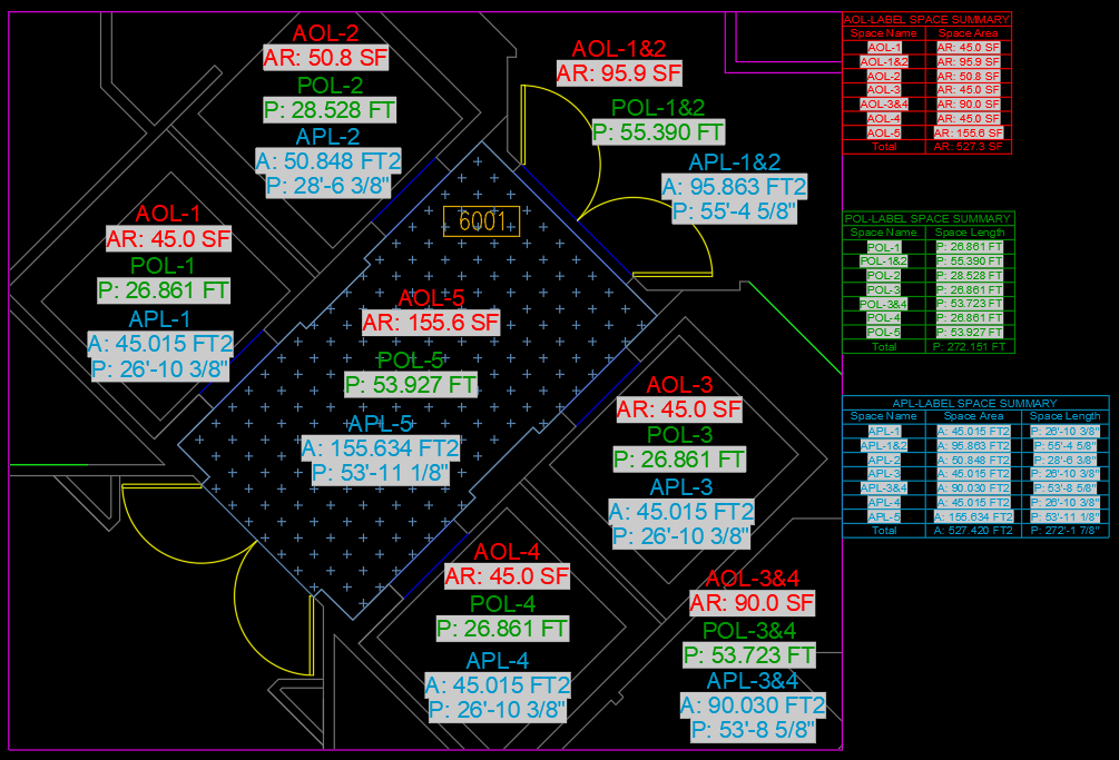 6. Update - gives the user the option to select pre-built AOL/POL/APL Block, Attribute, MText, and Text objects with Fields that contain linked Area / Perimeter values updating them to match the current AOL/POL/APL Option settings.