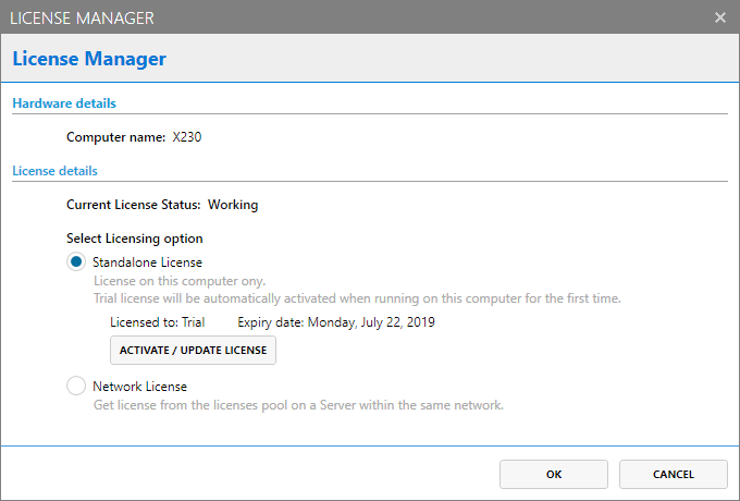 - Trial version: run the TTH_Toolset_License command and select the Standalone option when the license dialog pops up. Then, run any tool to start the trial period.