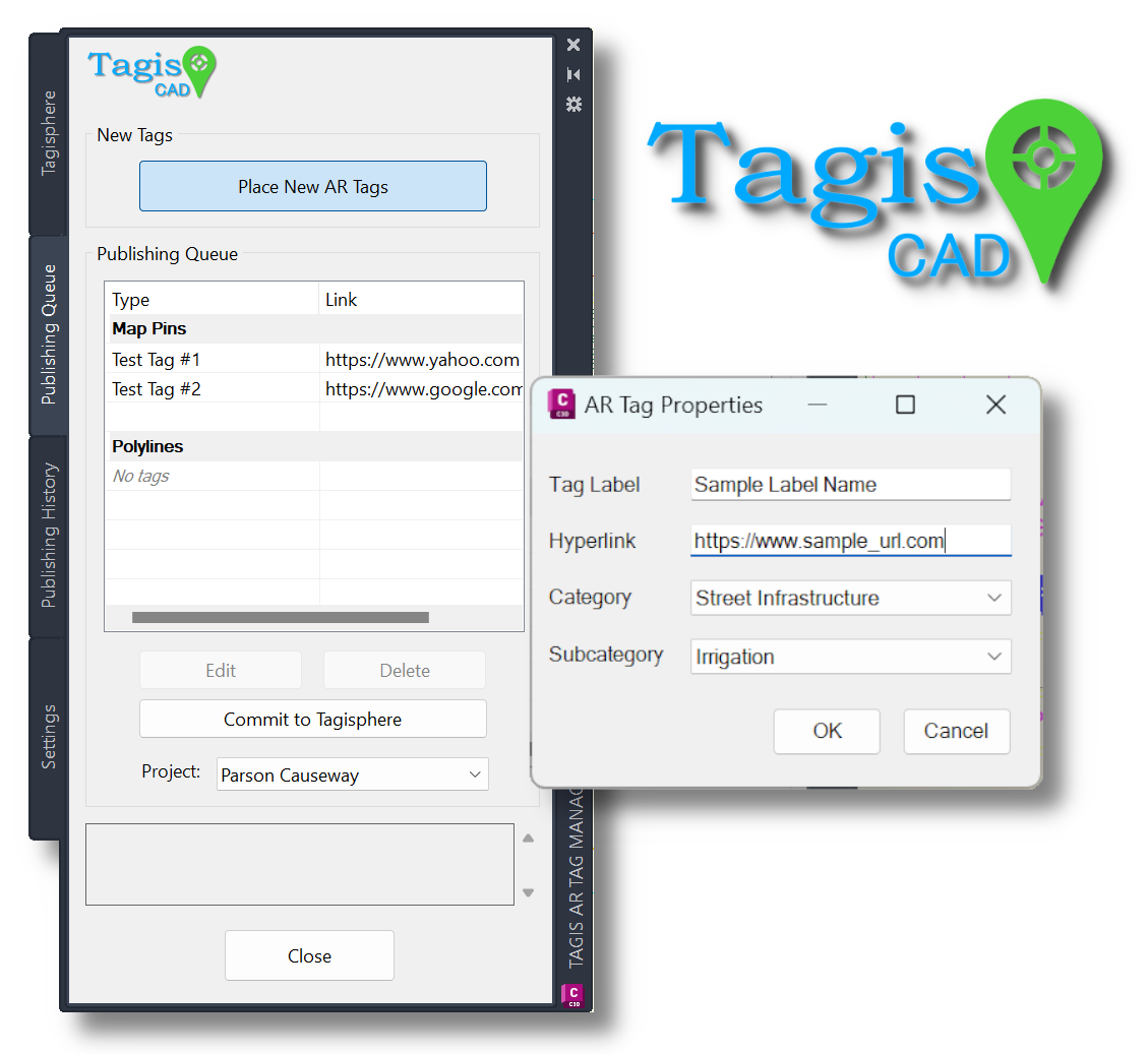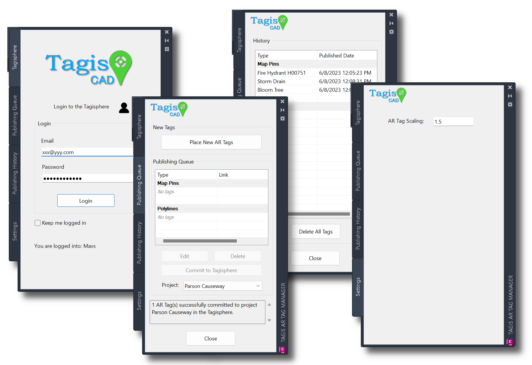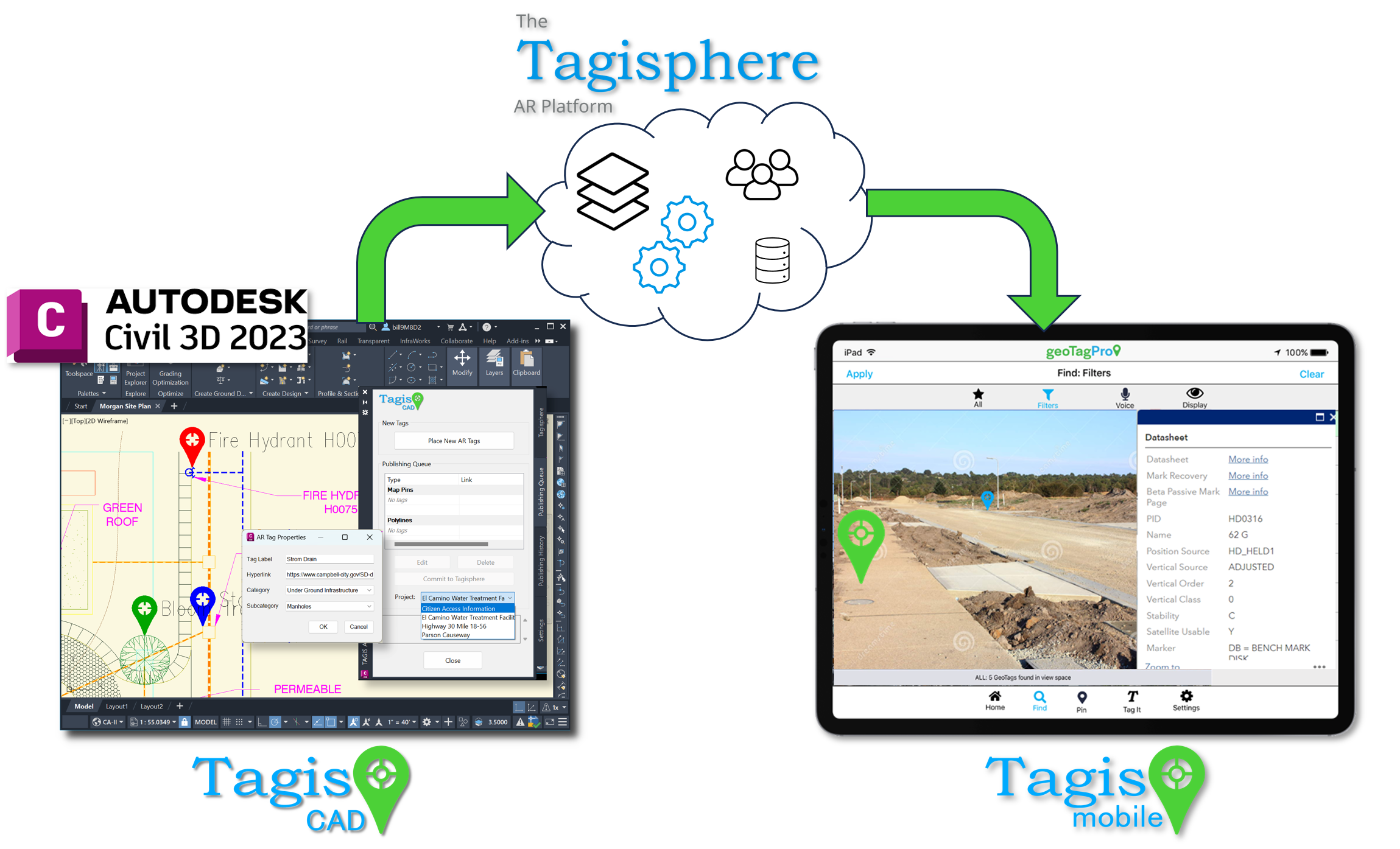 Tagis CAD allows users to geotag any location in the world from inside an Autodesk® Civil 3D® desktop session. This geotag is published to the Tagisphere(R) cloud server and instantly becomes available as Augmented Reality content in the real world. These geotags show up like a Google Map Pin in the real world. The geotags have a label and can have a hyperlink, allowing a field worker to easily find and instantly access information in the field.