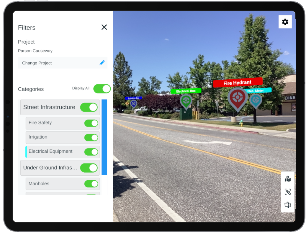 Field users access the data using AR Mavericks iOS app Tagis Mobile. When they start the app, it uses GPS to determine their geo-location and then contacts the Tagisphere cloud server. The server searches the database for any published geotags that are near their location. The mobile app then shows the user the nearby AR geotags.