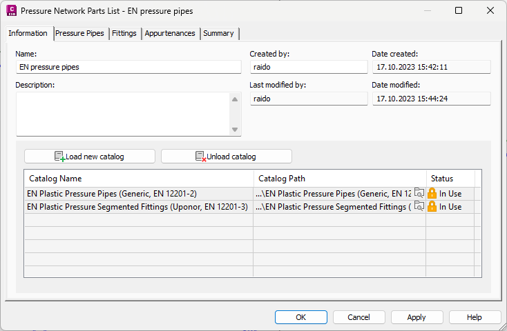 Cannot see any fitting list when setting up new catalog >>> for example EN plastic pipe Pressure pipe generic EN ISo 1452, the pressure pipe sizies do exist, but there is no fitting in the fittings Tab of Pressure network also there is no appurtencaces such as valves or hydrants.
