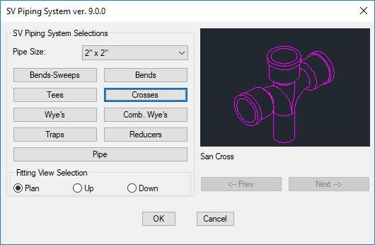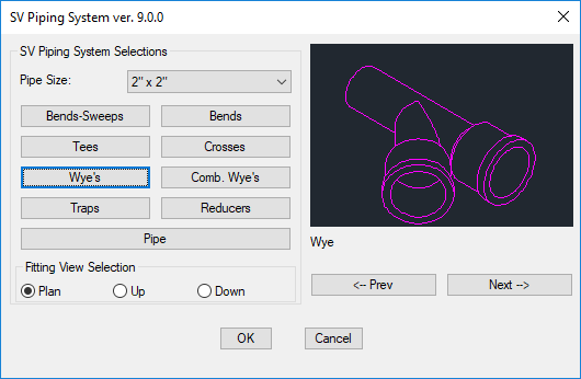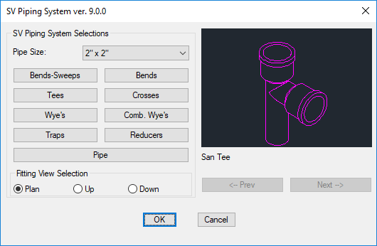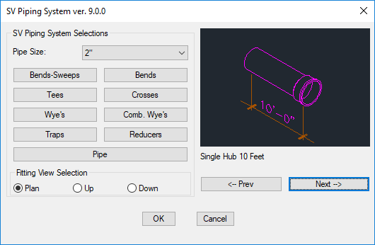 SV Hub & Spigot 3D Piping System inserts pipe and fittings in three different 3D views - Plan, Turned Up, and Turned Down.