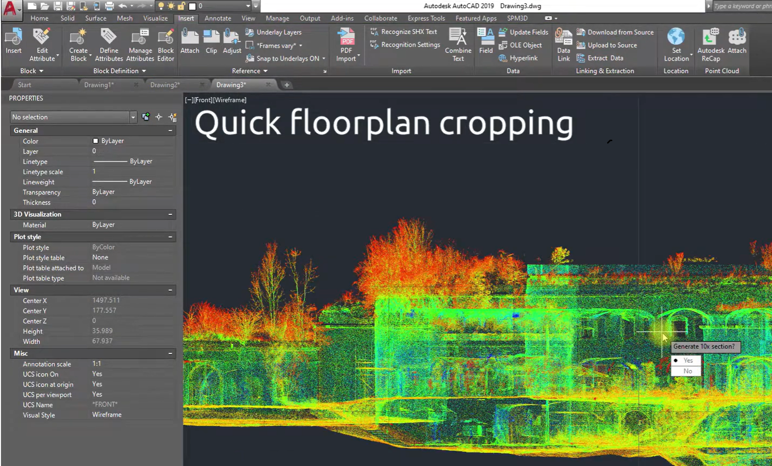 Vertical slice of point cloud. Specify left and right sides of section plane and select if you want to have section projection. Function will make a vertical slice of specified thickness + projection crop. Both will be saved as cropstates. UCS in section plane will be established for comfortable section drawing. |