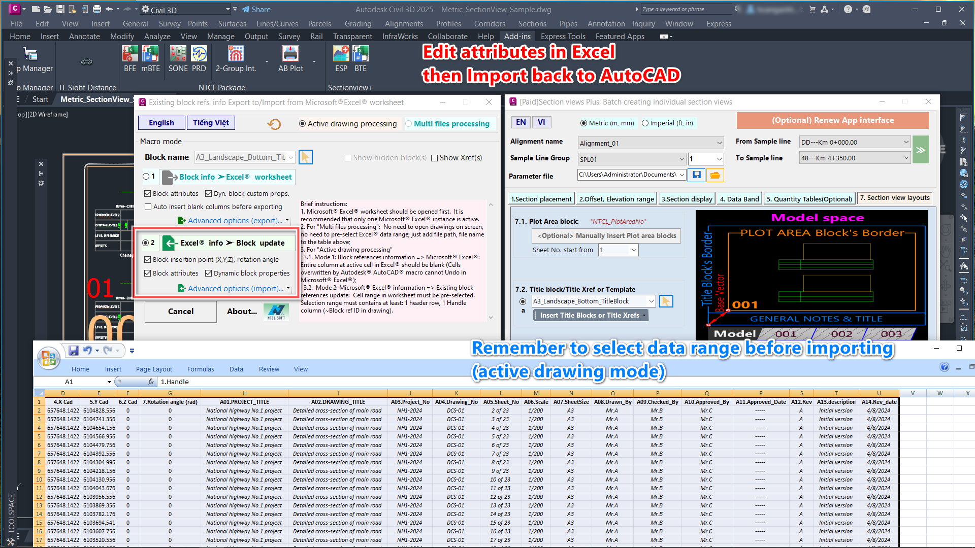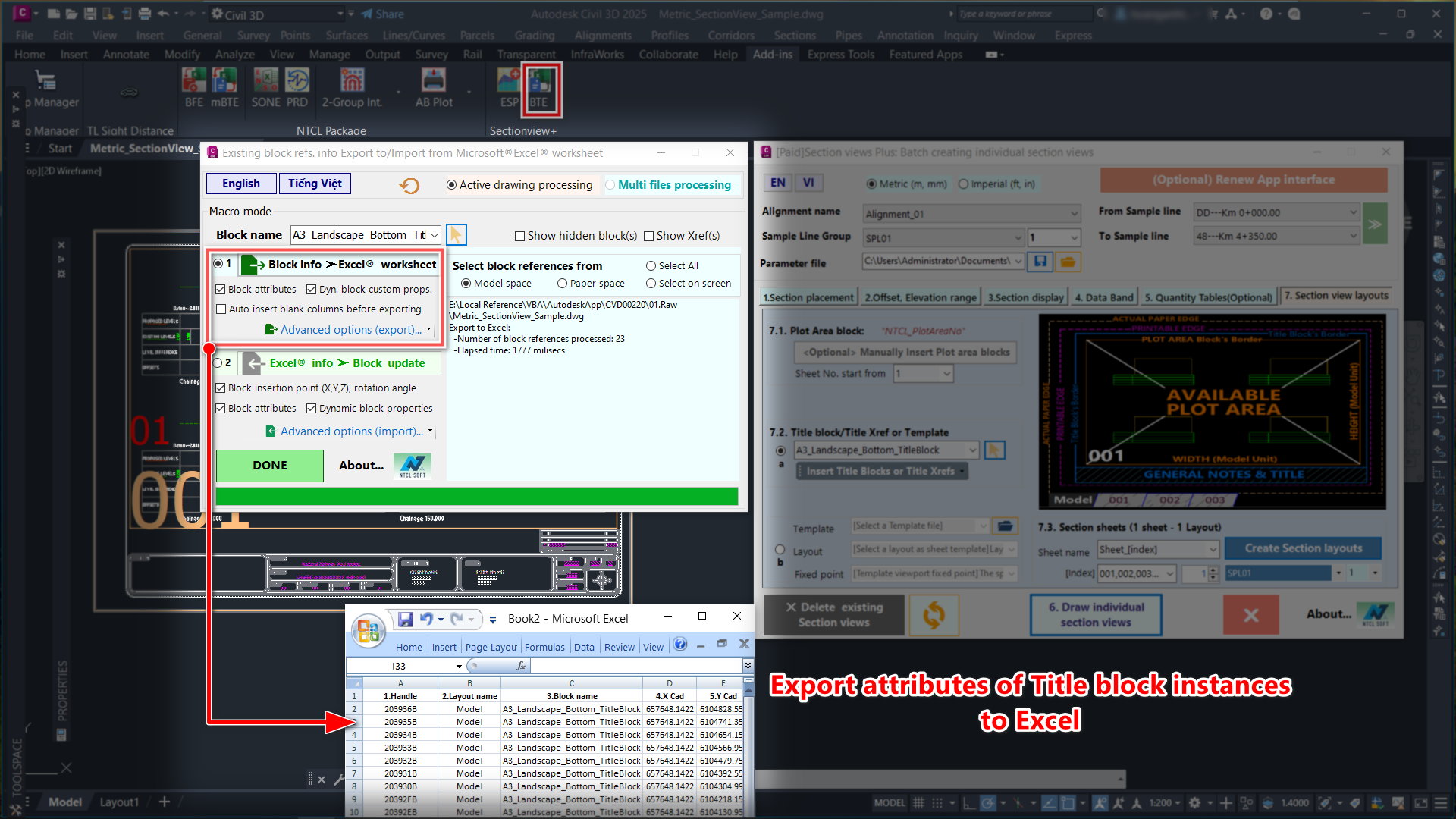 1. App comes with a lite version of Block-To-Excel app (supporting active drawing only), which is useful for batch filling Title block attributes.