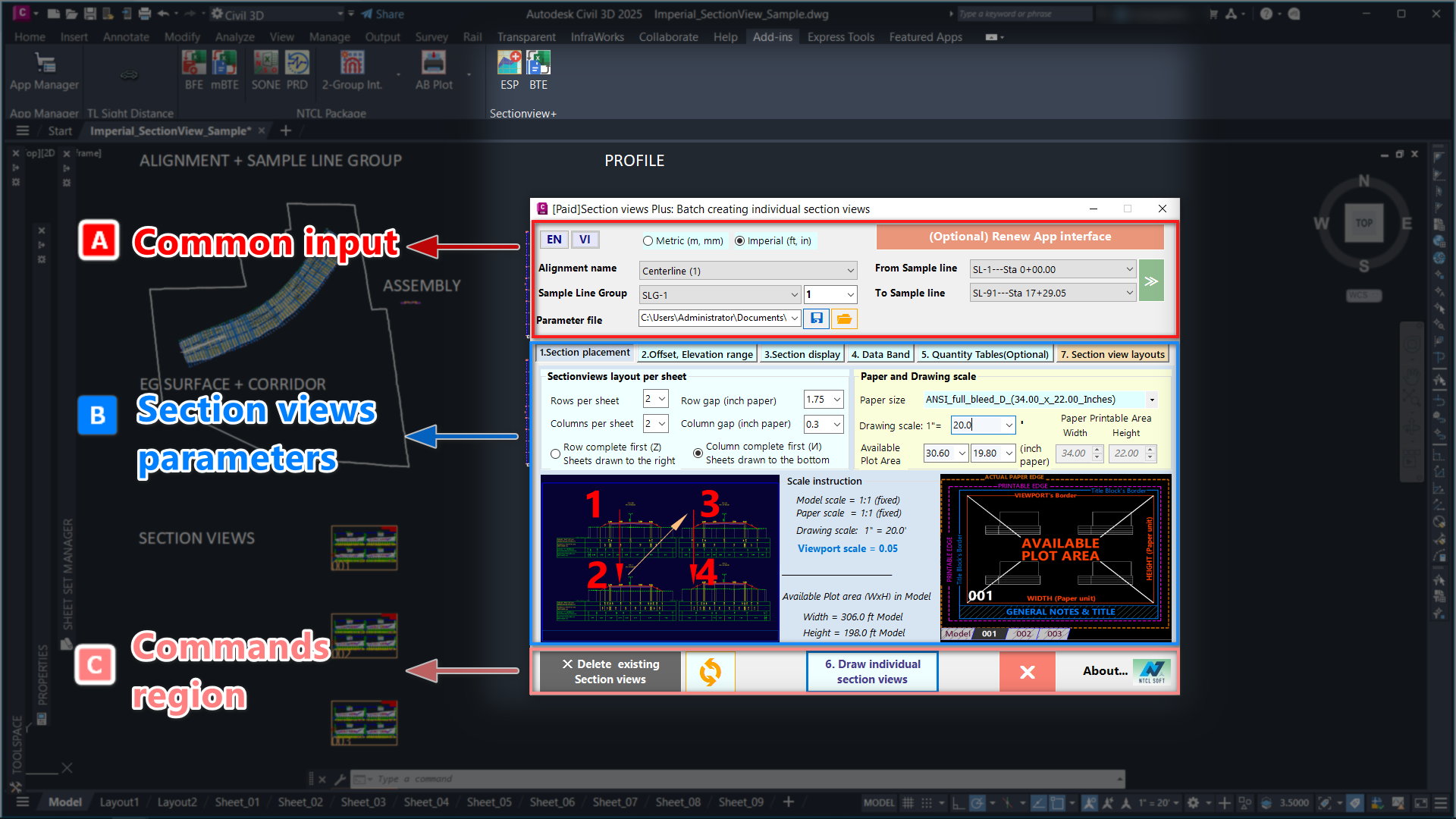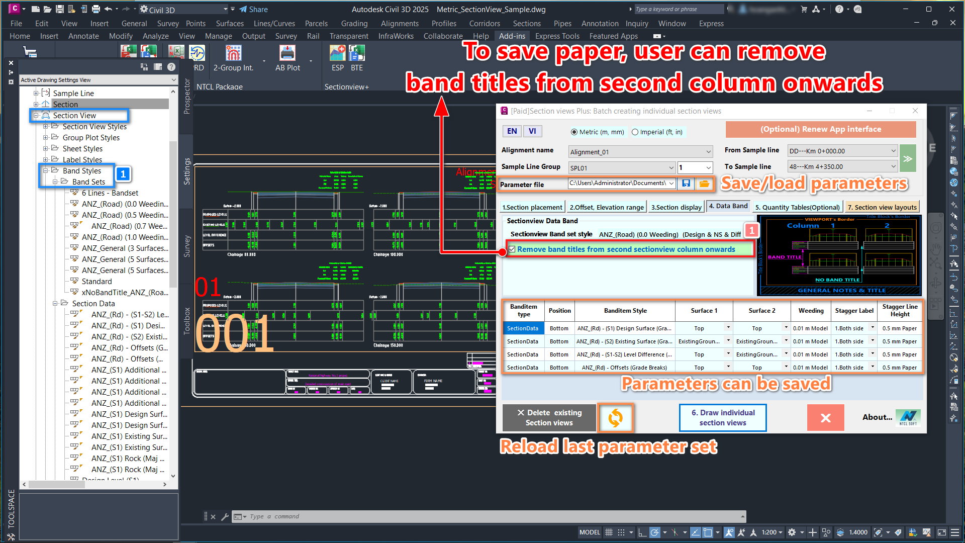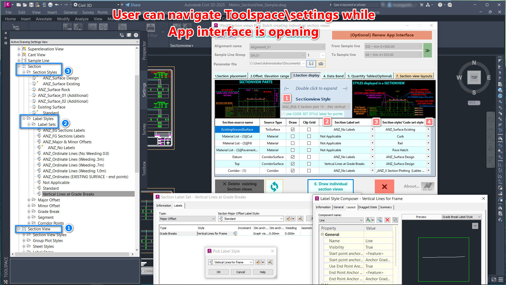 Section view creation in Autodesk® Civil 3D® is quite complicated with lots of parameters. This app will help ease the section view task by making use of individual section views and adding the following features: