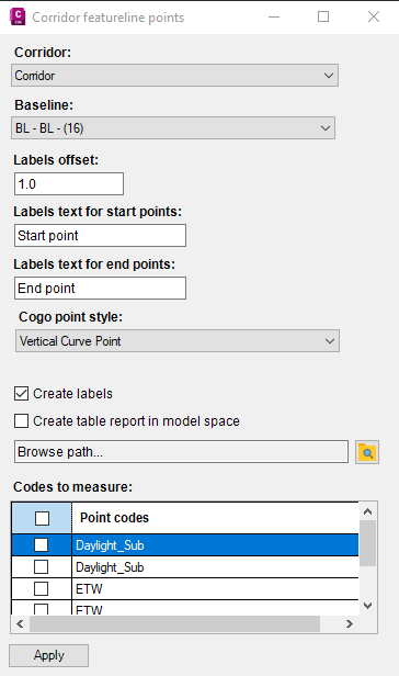 The app creates cogo points at the start and end points of selected feature line corridors. Each point has a custom-made label that contains the stationing of the point in relation to the baseline. Also, the user can enter the text that he wants to be displayed next to the start and endpoints.