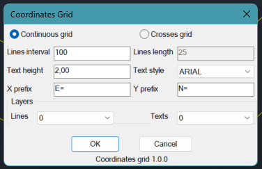 In the dialog box, you can configure all the grid properties. Start by choosing between a continuous grid or a grid with crosses. The continuous grid will draw lines throughout the limits of the polylines, while a cross grid will place crosses at the intersections of the lines (see screenshots for reference).