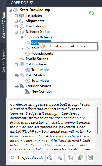 Corridor EZ delivers 'Artificial Intelligence' assisted creation of your entire road network via Project Assist. Once your surface and alignments are created, you can assign your templates and ‘Project Assist’ generates the design for an entire subdivision in a single operation including all curb returns, cul-de-sacs and knuckles. All these elements are tied together so changing the vertical design of one road updates all of the connected profiles.