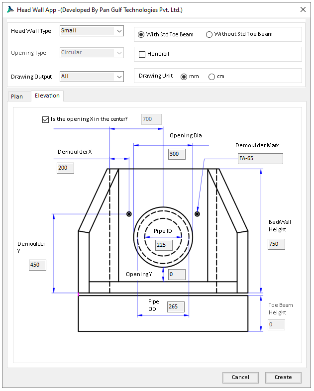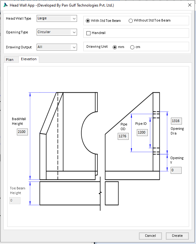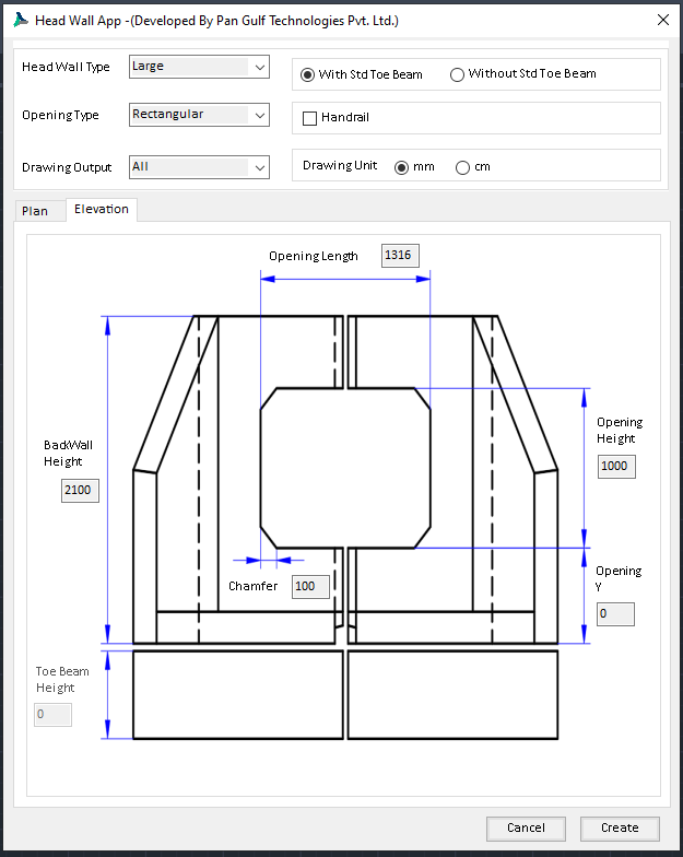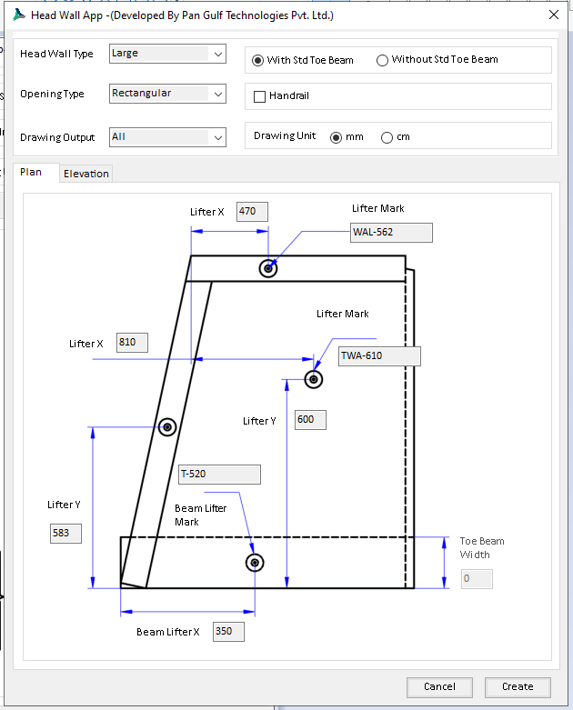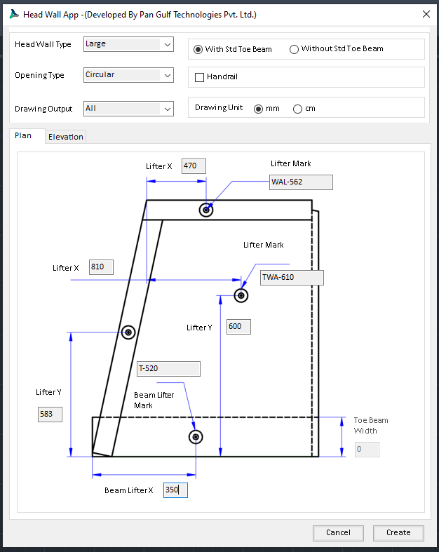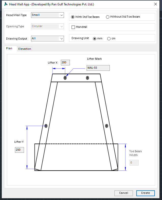 Automatically creates shop drawings of headwall as per given input from the user interface. This tool gives users wide options for customization of headwall drawings as per requirement. It creates shop drawings with minute details such as the type of headwall, and different shapes of opening. It also allows the user to obtain only a 3D view take the center of gravity of the 3D and calculate the lifter position.