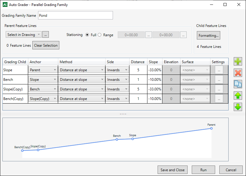 Create dynamic site grading models by linking feature line sets. Surface breaklines are automatically managed. Save design templates for future use.