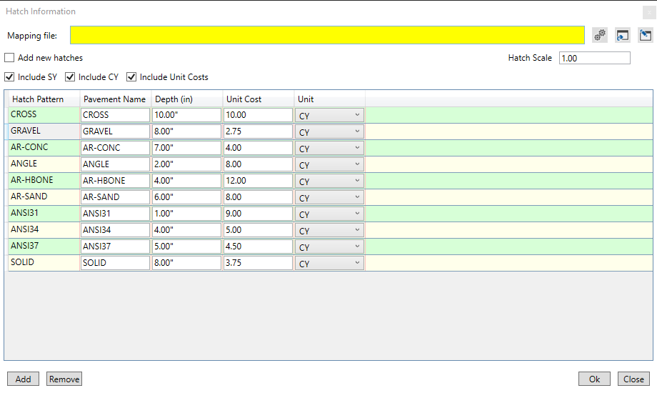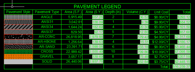 A tool to report pavement quantities based on hatches. Select the hatches and place a table showing the area and cubic yardage of the pavement.