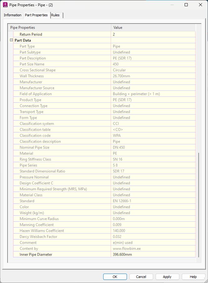 Note: This catalogue can be successfully used with Autodesk® Storm and Sanitary Analysis package, because pipes will be always carried over with its real pipe inner diameter value. Pipe general diameter or any other property can be used in labels or taken over into Property Set Definitions.