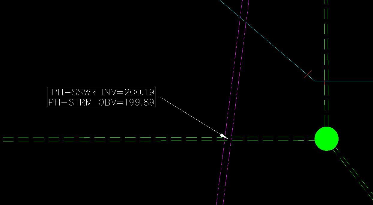 A leader with text is then added to the drawing showing the obvert (crown) of the pipe at a lower elevation and the invert of the pipe at the higher elevation.