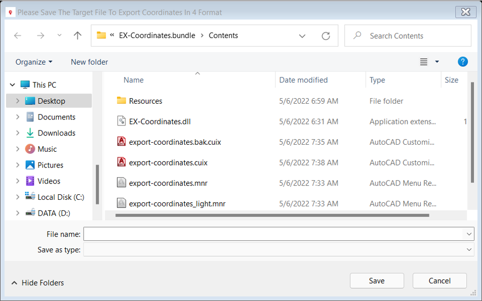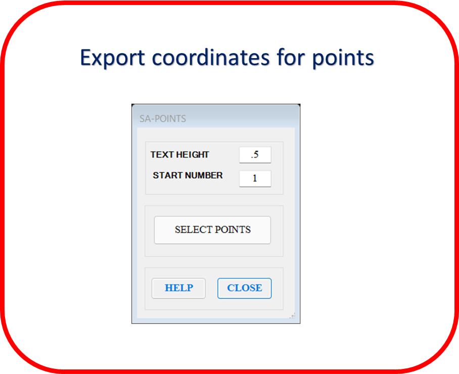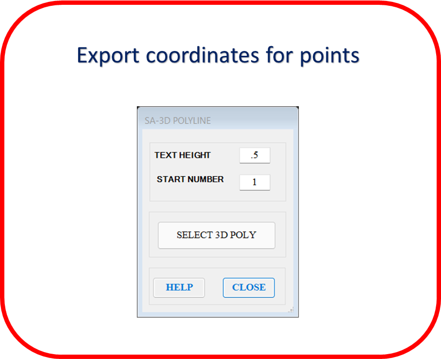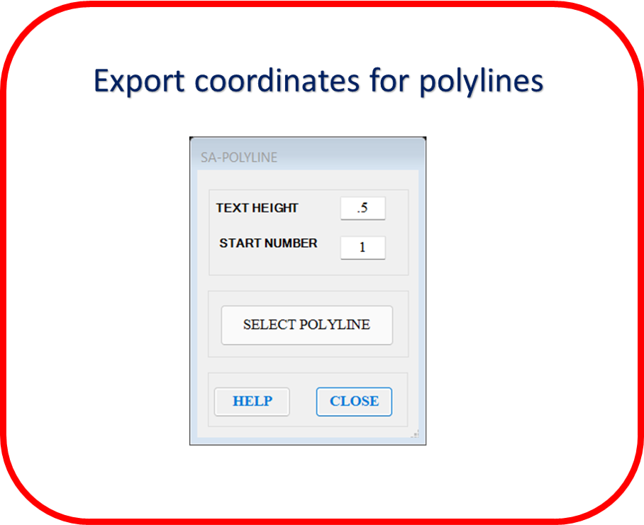 Export coordinates for many objects (polylines, points, blocks, pick points, circles, 3D polylines) in four formats (SDR, GSI, TXT, CSV) directly you have the option to create a table in Autodesk® AutoCAD®.