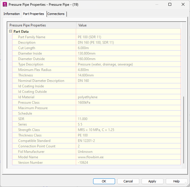 Autodesk® Civil 3D® Pressure Network, plastic pipes, catalog to be used according to EN standards. Content has been realigned from the version 2022.0. Content is divided into 2 main groups (Generic and Manufacturer). All pipes are now fully based on EN/ISO standards. Additional information has been attached into pipe properties if applicable according to the standard (PN, SDR, SN, Design Coefficient C, Minimum Required Strength, Material Class etc.). Manufacturer specific content is now divided into its own catalog. Manufacturer specific pipes are also divided according to EN/ISO standard, but product names are used according to Manufacturer data sheets.