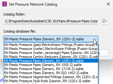 Cannot see any fitting list when setting up new catalog >>> for example EN plastic pipe Pressure pipe generic EN ISo 1452, the pressure pipe sizies do exist, but there is no fitting in the fittings Tab of Pressure network also there is no appurtencaces such as valves or hydrants.