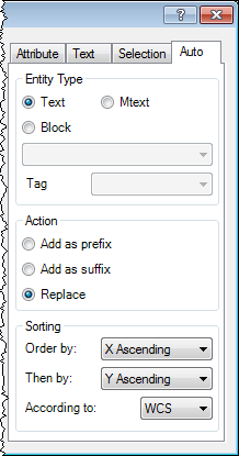 - The 'Auto' tab allows for an automatic increment of a selection set of texts, mtexts, or block attributes according to ascending or descending X and Y coordinates.