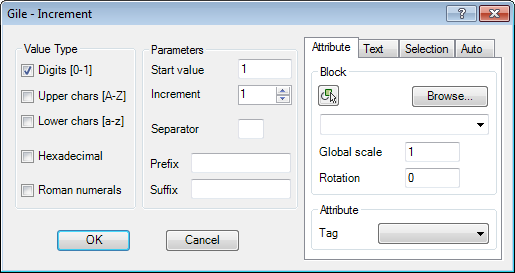 - The 'Attribute' tab is used to increment an attribute value at each block insertion. The user selects the block to insert and the attribute to increment; he can also set some block properties (global scale and rotation).