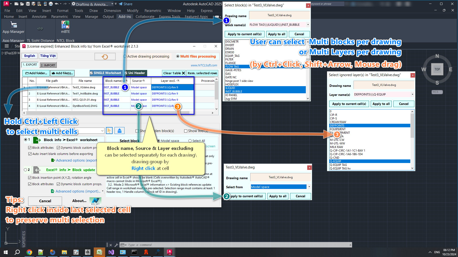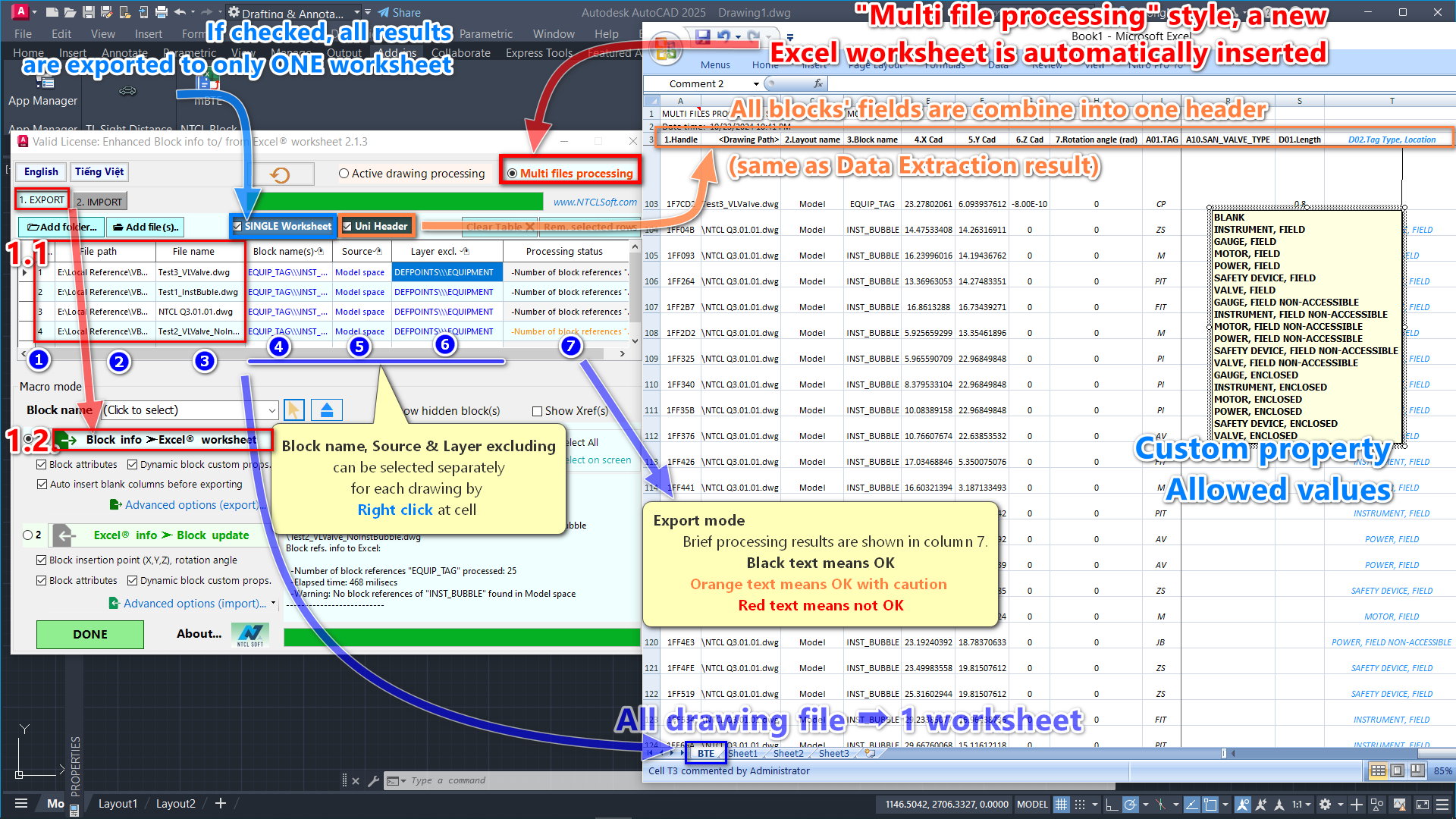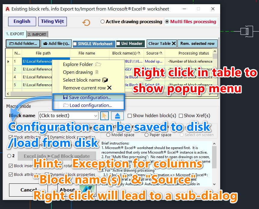 For Multi-files processing, it's not necessary to open the drawing on-screen or manually select the Excel data range; just add files to the list, fill in parameters per file, and then export or import.