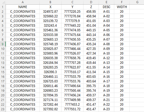 In the first row, the first four columns should always contain these headers: NAME, X, Y, Z (see example images). From the fifth column onwards, you can insert attribute tags or dynamic property names that you want to apply to the blocks being inserted. Beyond the fourth column, all other columns are optional.