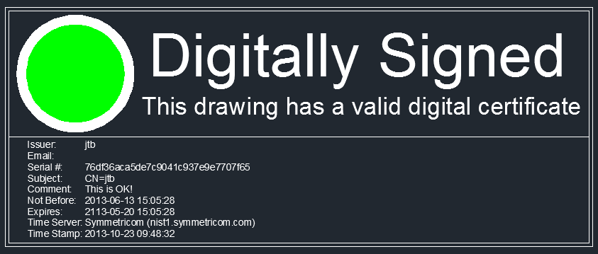 The JTB DigSigStamp app helps you identify visually when drawings have valid digital signatures. You use one of the apps' commands to specify blocks to display when a drawing has a valid digital signature and when it does not. You then assign a particular block reference - which usually exists in the title block of your drawing - that will change its display to one of these two block definitions depending on the state of the drawing. The application even works when plotting, an operation that typically invalidates a drawing's digital signature.