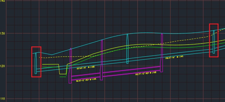 - Create a 3D polyline along the selected pipe network structures or pipe, using the top, center, or invert elevations of the pipes.