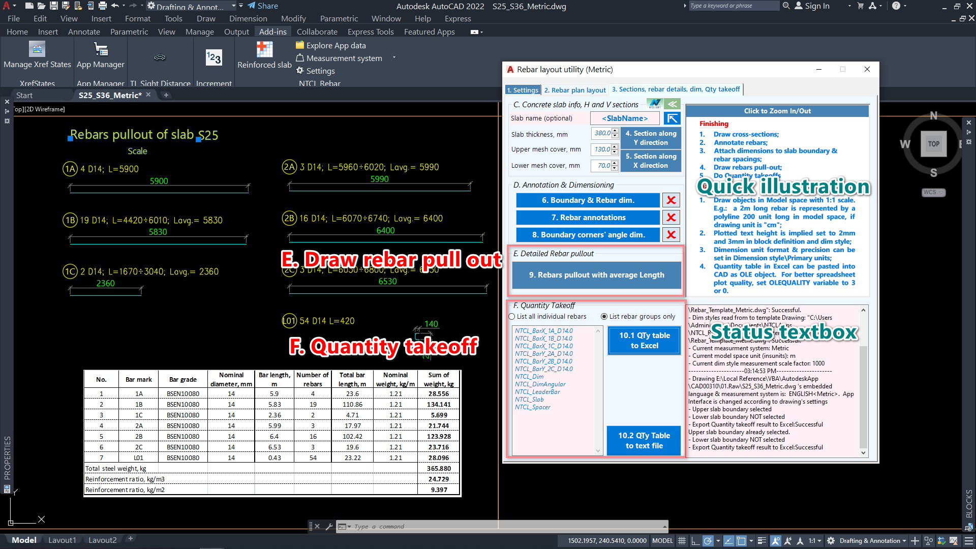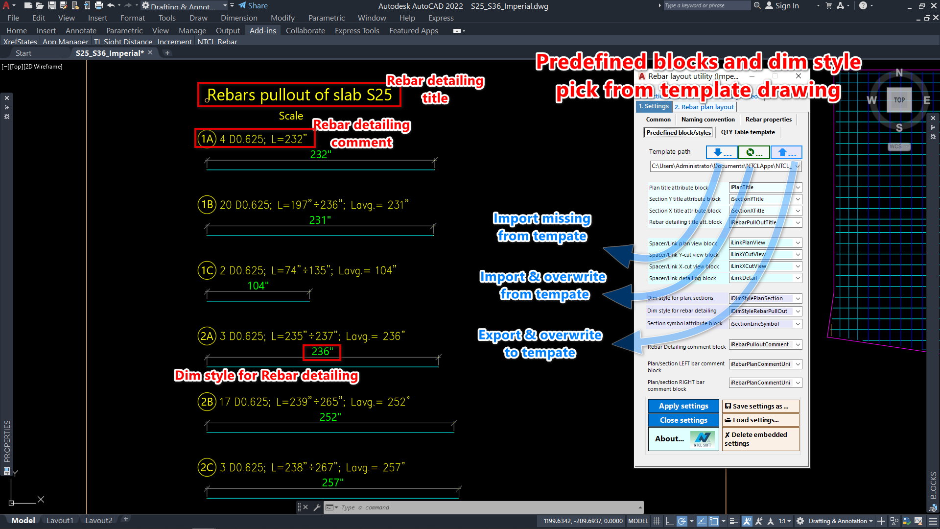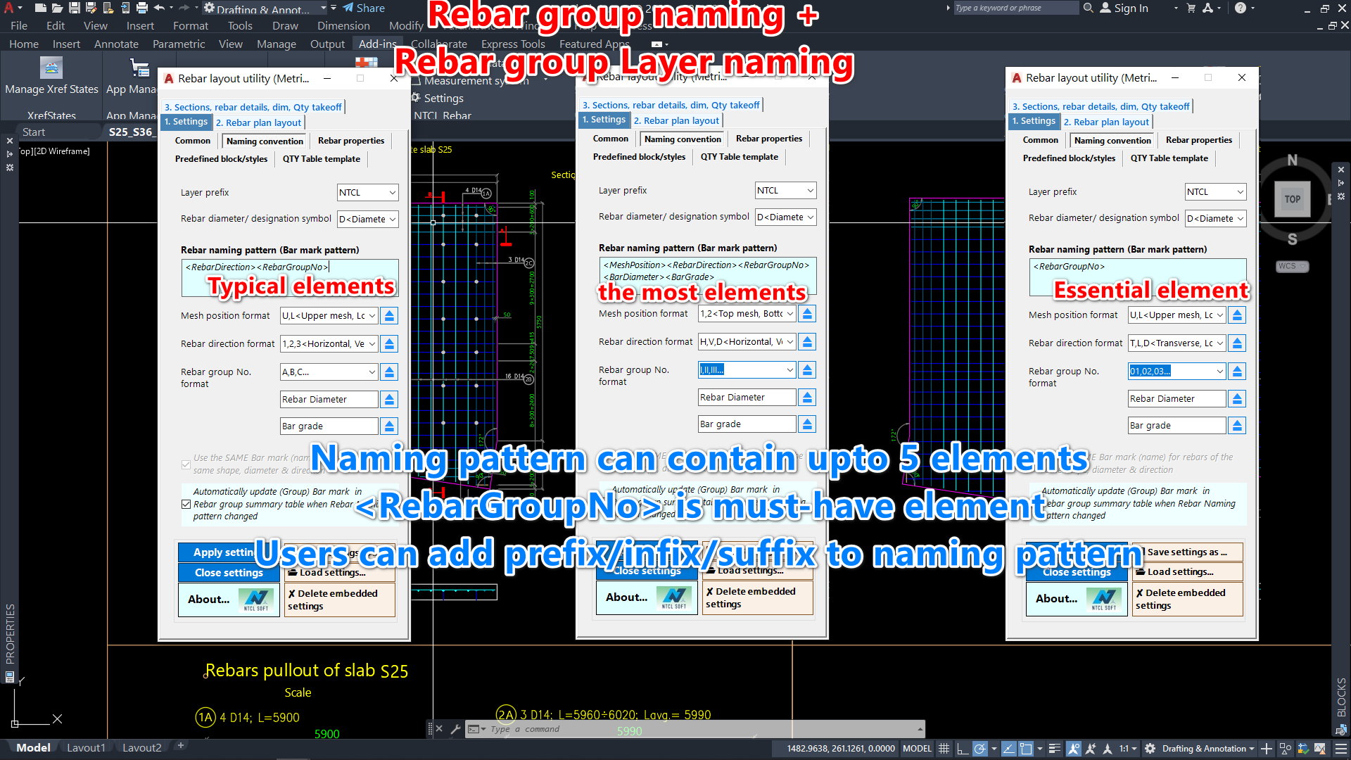 - Boundary and reinforcement spacings dimensioning, rebar groups annotation