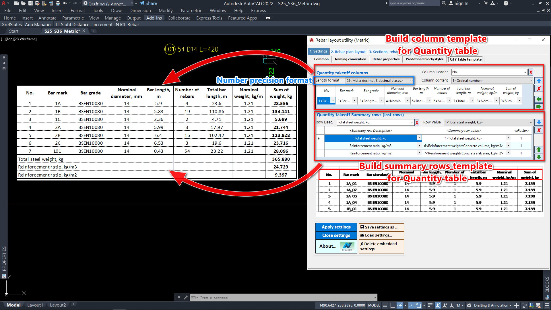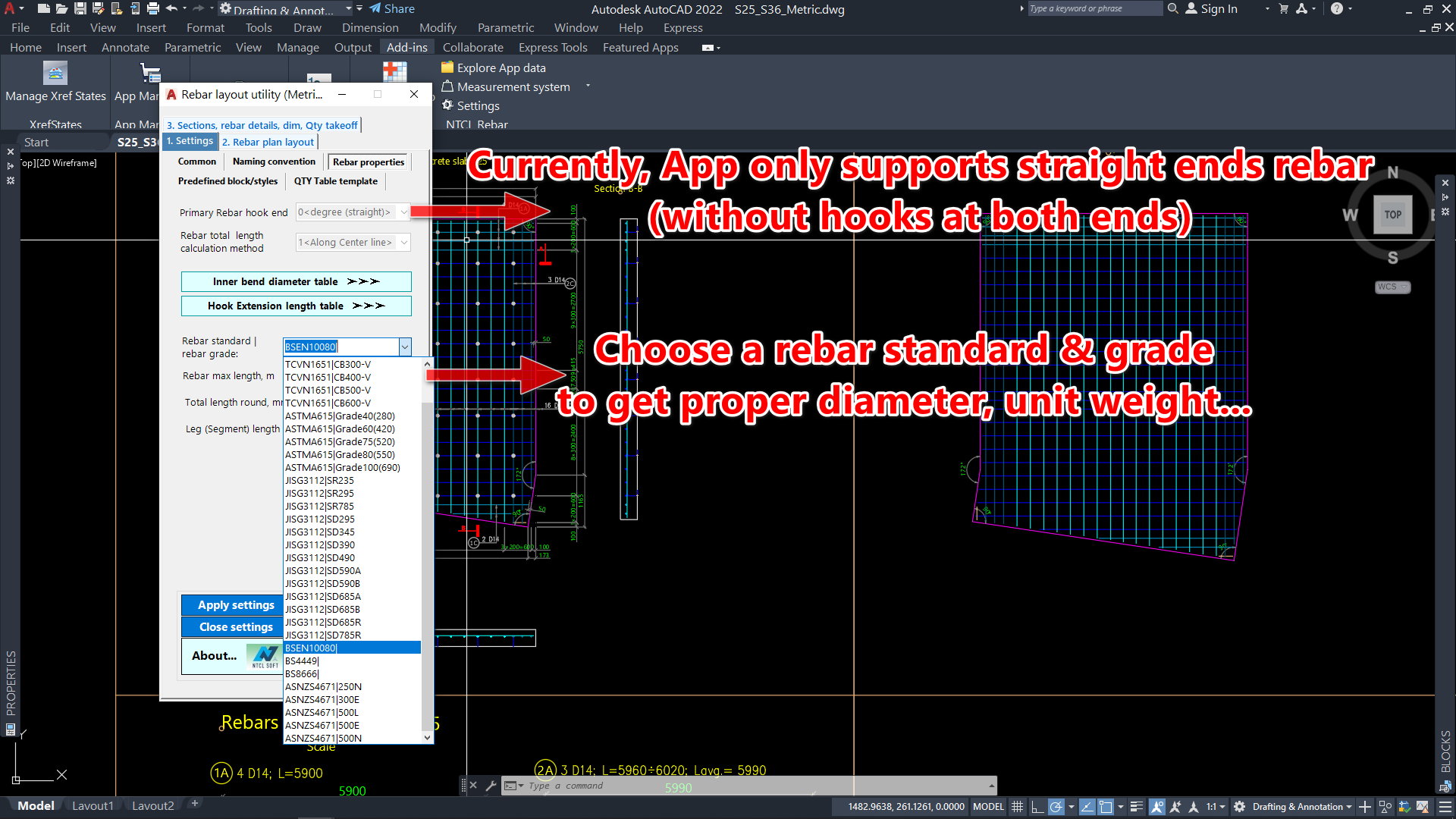 - Rebar parameters (diameter, unit weight...) of the following standards are supported: ASTM A615, AS/NZS 4671, BS EN 10080, BS 4449, BS 8666, JIS G 3112, TCVN 1651