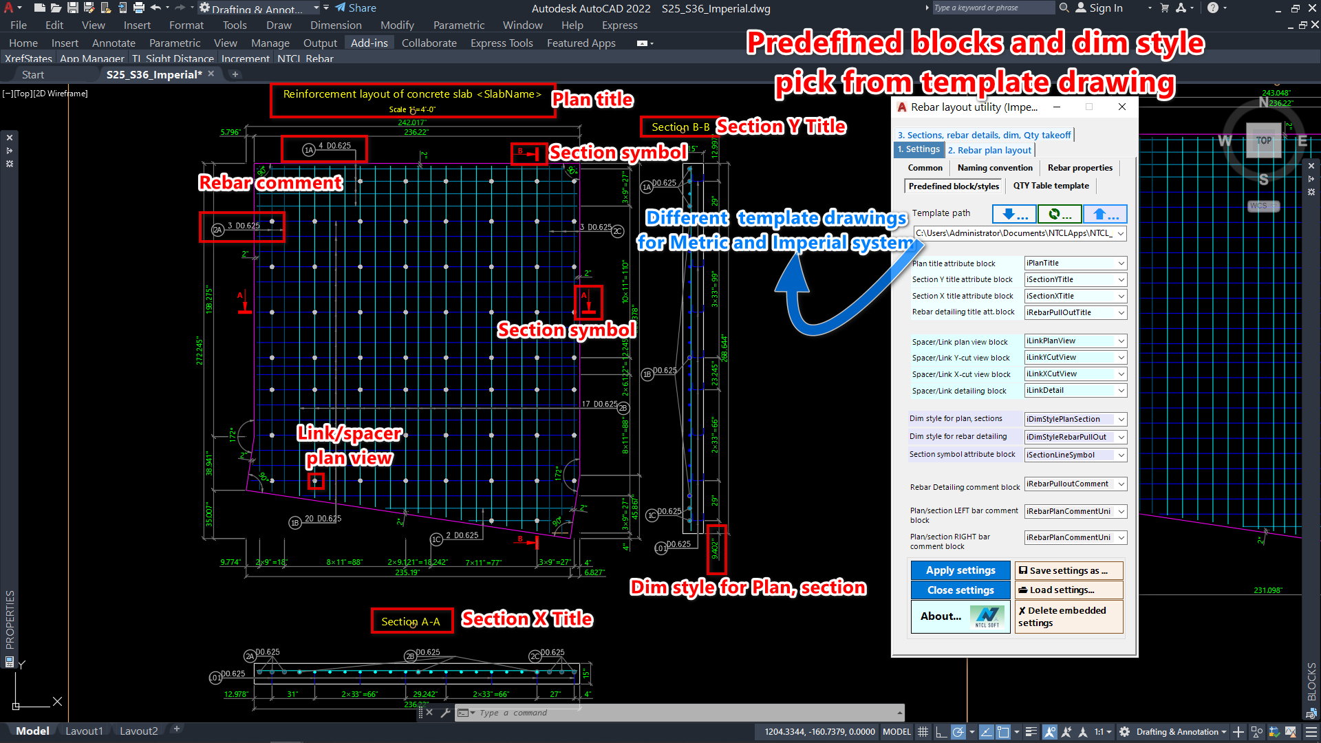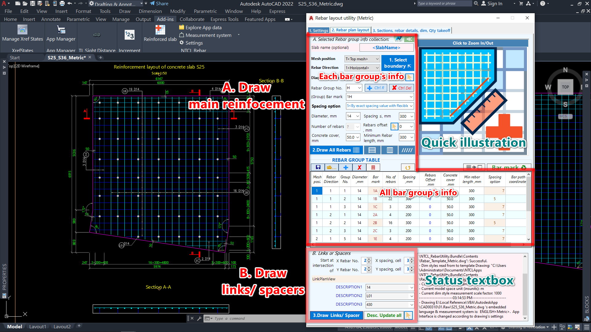 1. This app will NOT design the reinforced structure for you; it just draws. Bars' diameter, minimum required spacing, slab thickness, concrete cover ... must be set manually but can be saved to use later;