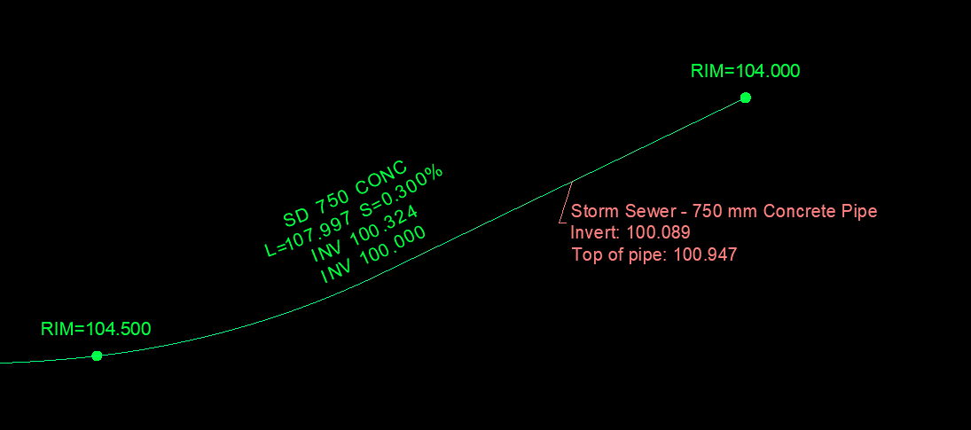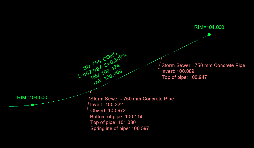 Label any combination of invert, obvert, top of pipe, bottom of pipe, springline, diameter and network of a pipe at a given location.