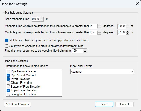 Set the elevation of pipes based on another pipe connected to the same manhole, with a modifiable set of default rules (match obverts, elevation difference based on relative pipe angles) or enter a specific difference in inverts.
