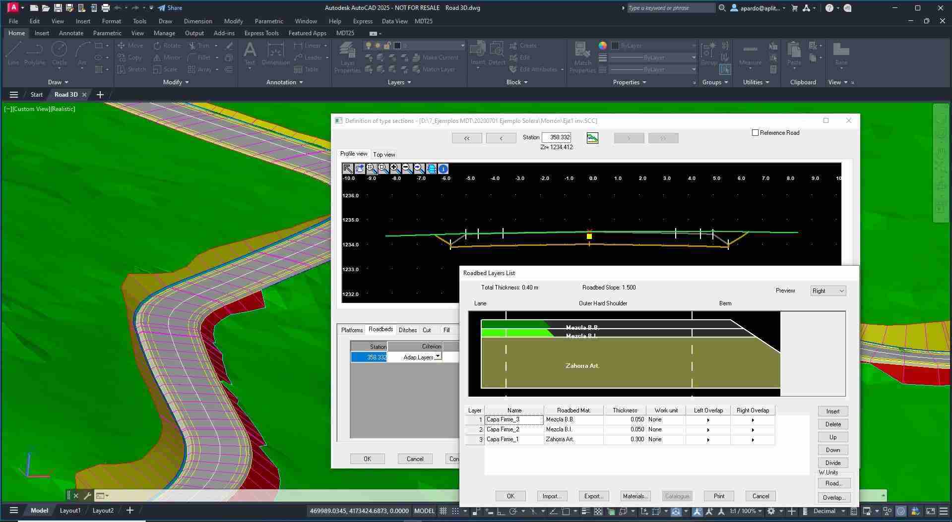 - Definition of standard sections (platforms, ditches, slopes, pavement layers, etc.)