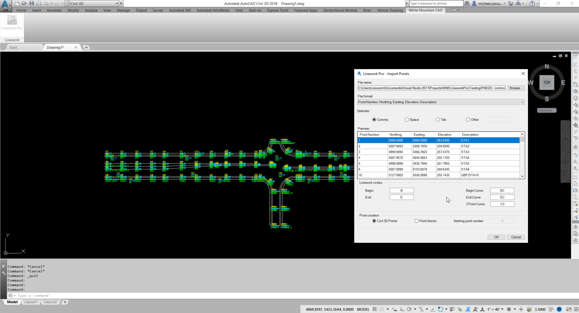 Import delimited point files (PNEZD, PENZD, etc) into Autodesk® AutoCAD® to plot points and their connected linework as 2D polylines.