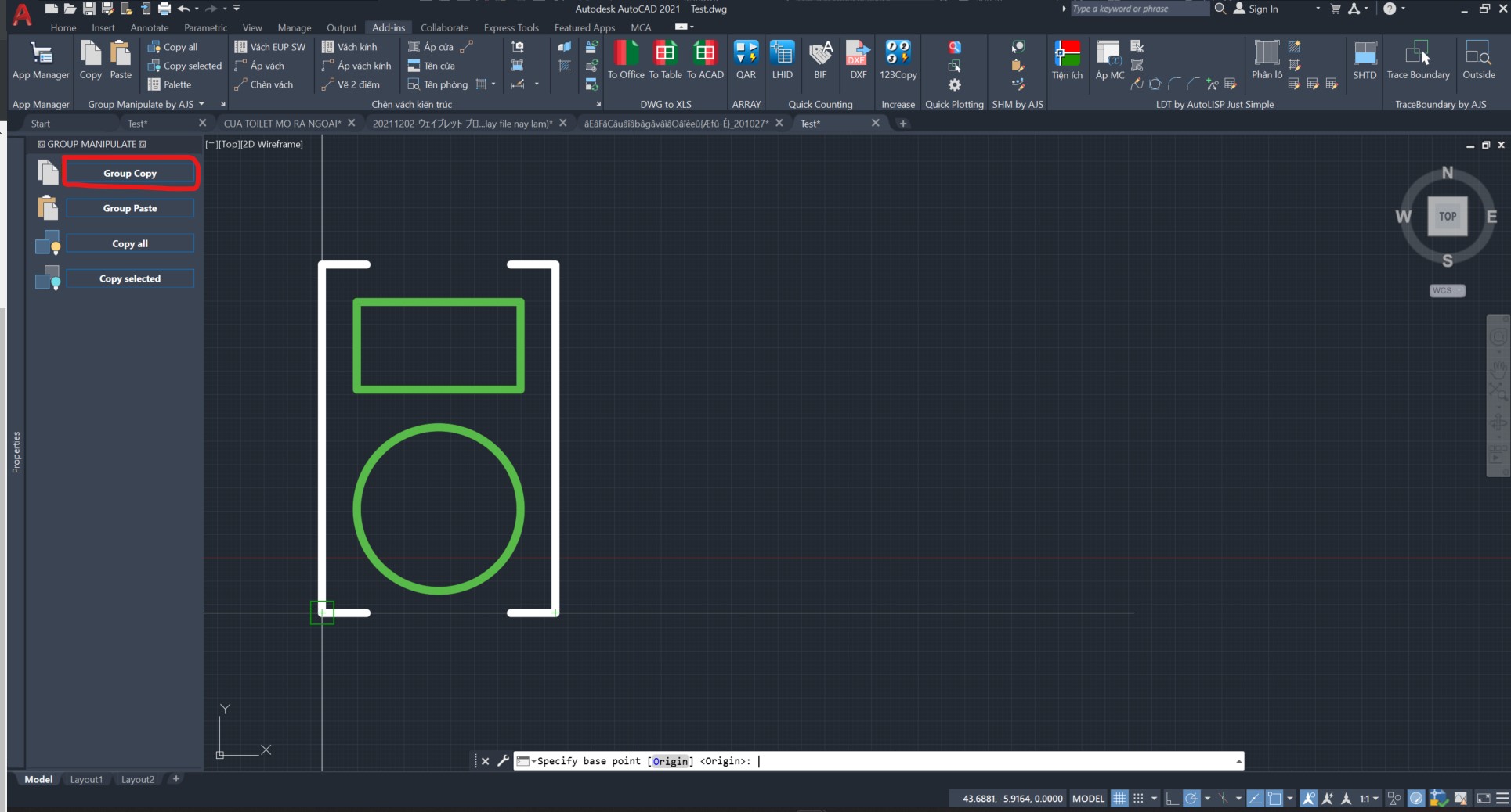 Open source drawing, using GCPY (Group Copy) command, select objects with base point. Please do not close this drawing.