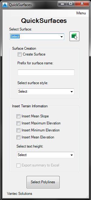 The QuickSurfaces plugin for Autodesk® Civil 3D® provides an easy way to extract multiple “child” surfaces from an existing surface by selecting polylines or parcels that define their outer boundary. For optimized file size the option to apply a crop to the child surface is available. The plugin assigns the child surfaces a user-specified style and extracts terrain information, including mean slope, mean elevation, and minimum and maximum elevations. The user has the option to create child surfaces or just extract terrain information.