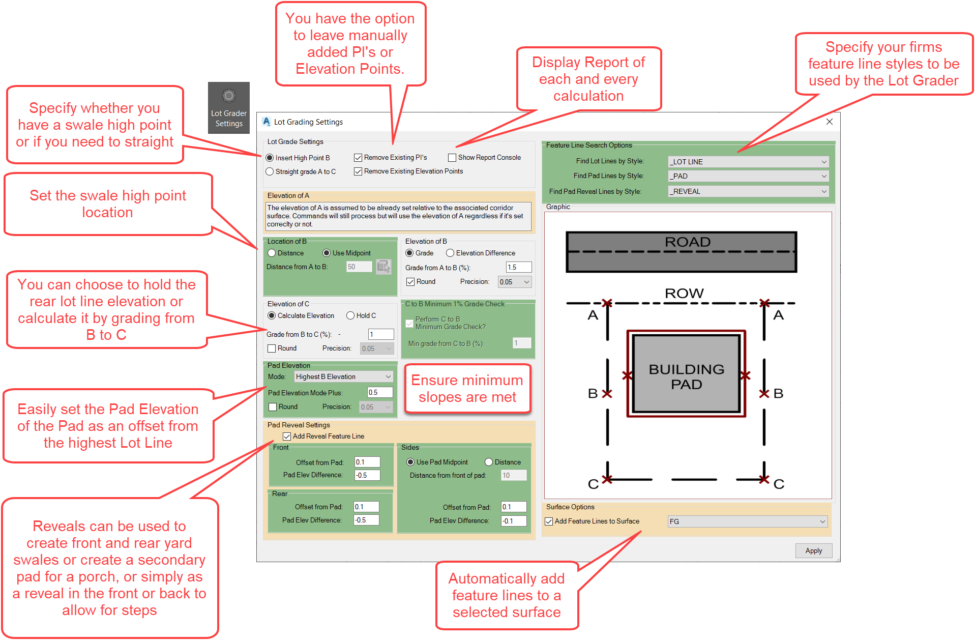 The tools offer a variety of grading parameters and checks to automatically set lot elevations and pad elevations, including a reveal feature line that is offset from the pad at a specified distance. The reveal parameters can be used to set ground grades next to the pad, ensure a rear patio slopes away from the pad, and more. Another key feature of the app is the ability to label lot grading plans in just a few clicks with its Labeling Tool. With the Labeling Tool feature in the app, users can easily label lot line elevation and high points, pad elevations, as well as pad reveal elevations.
