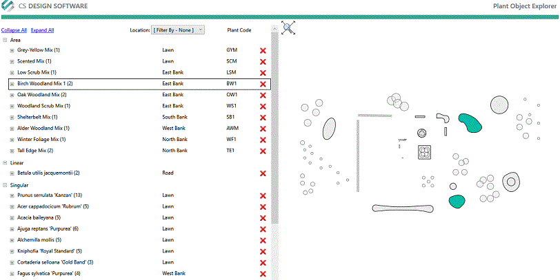 Plant Browser - manage planting model content via intelligent edit + substitution tools and Plant Browser - dedicated panel showing all planting model content in a structured list view and associated graphical plan view.
